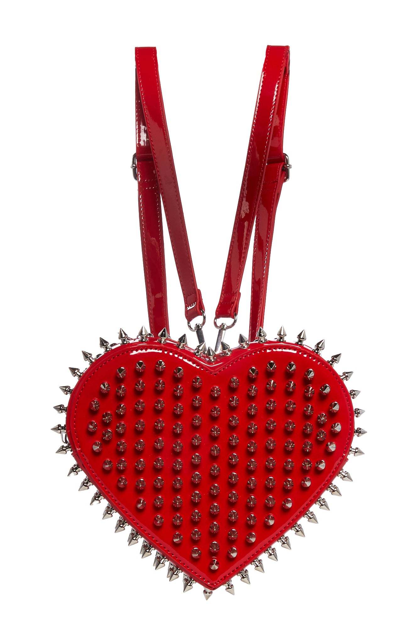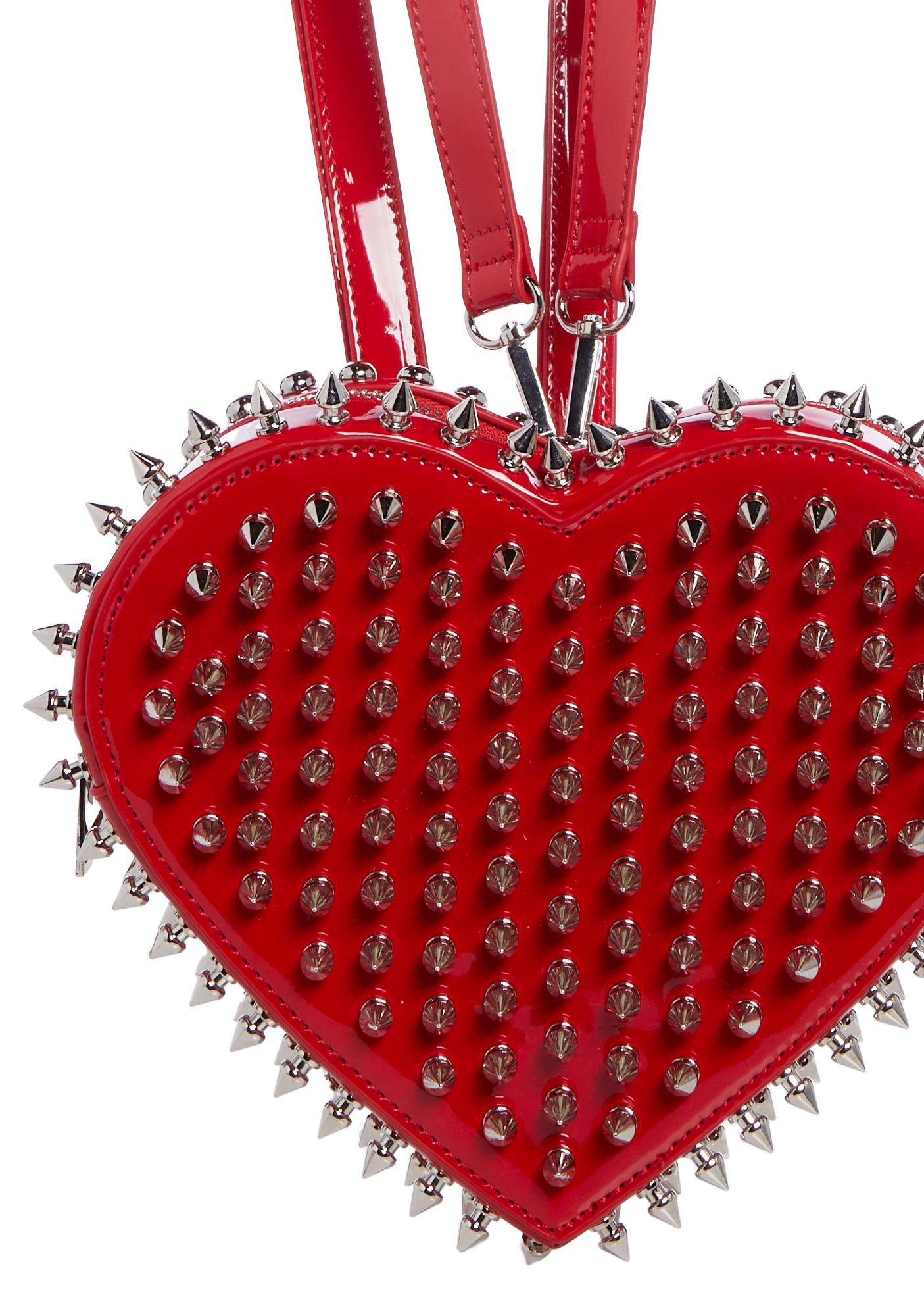 cuz your love is fierce and untamed. This backpack has a patent vegan leather construction, a top zip closure, studded embellishments, and adjustable and detachable shoulder straps.