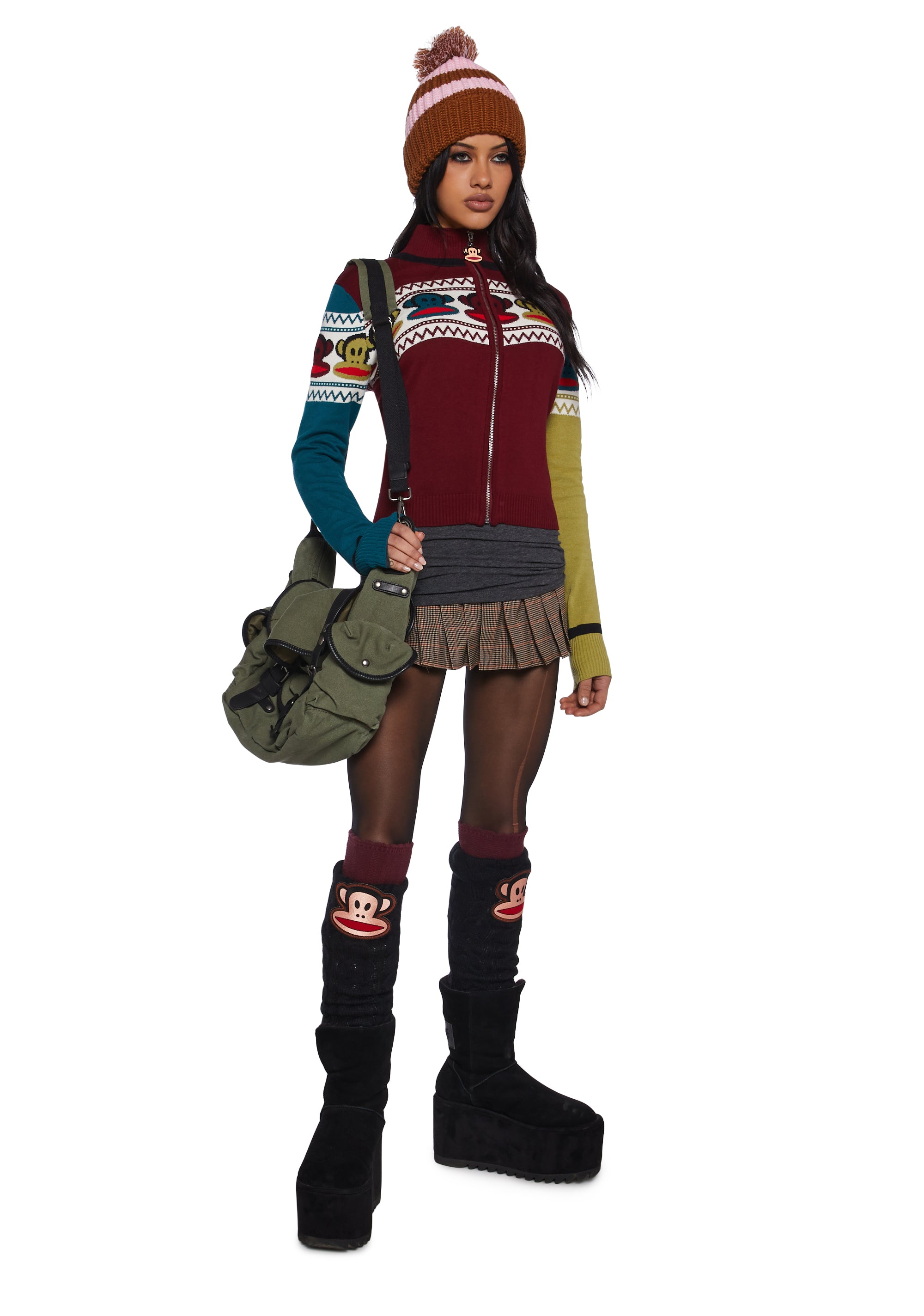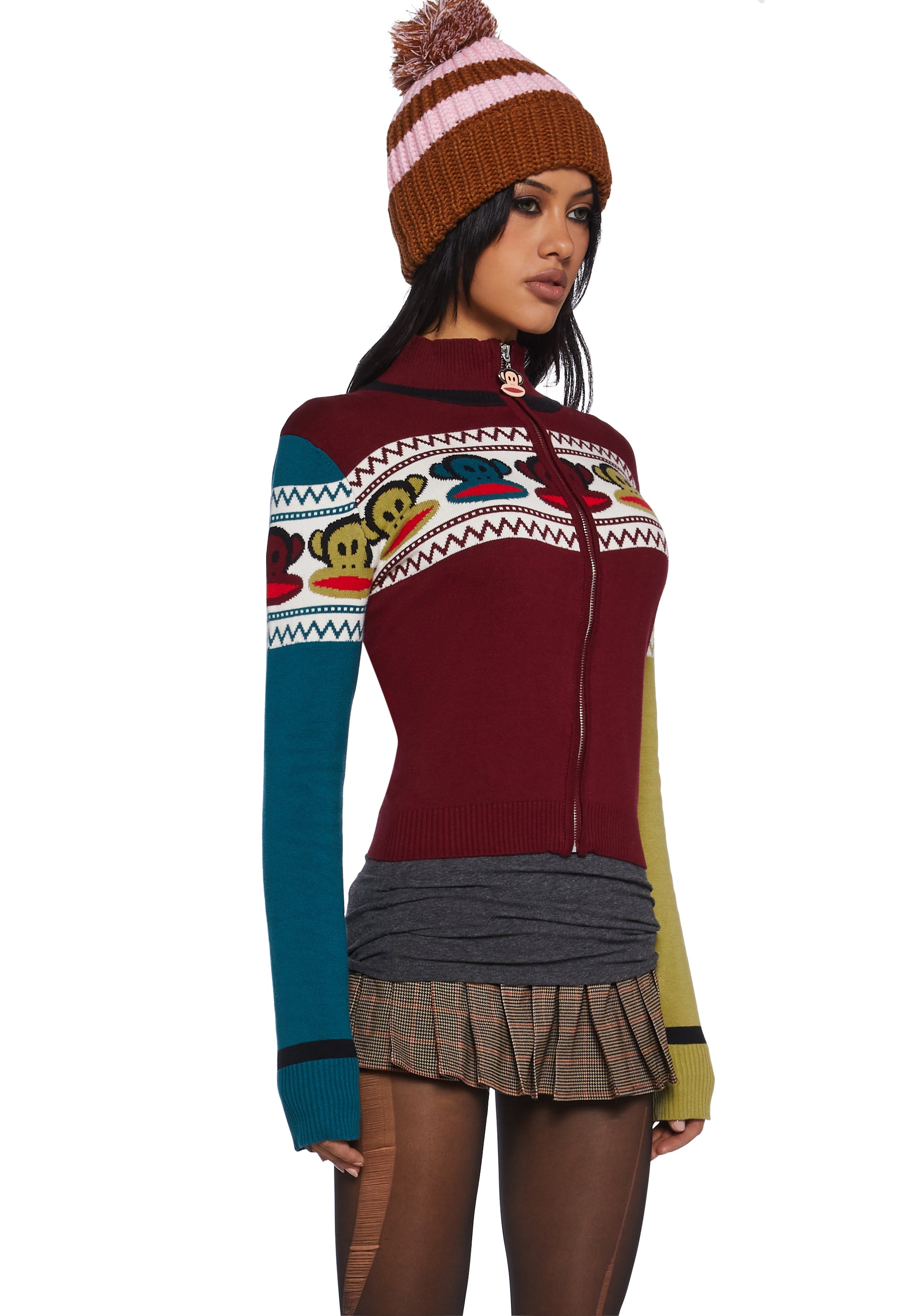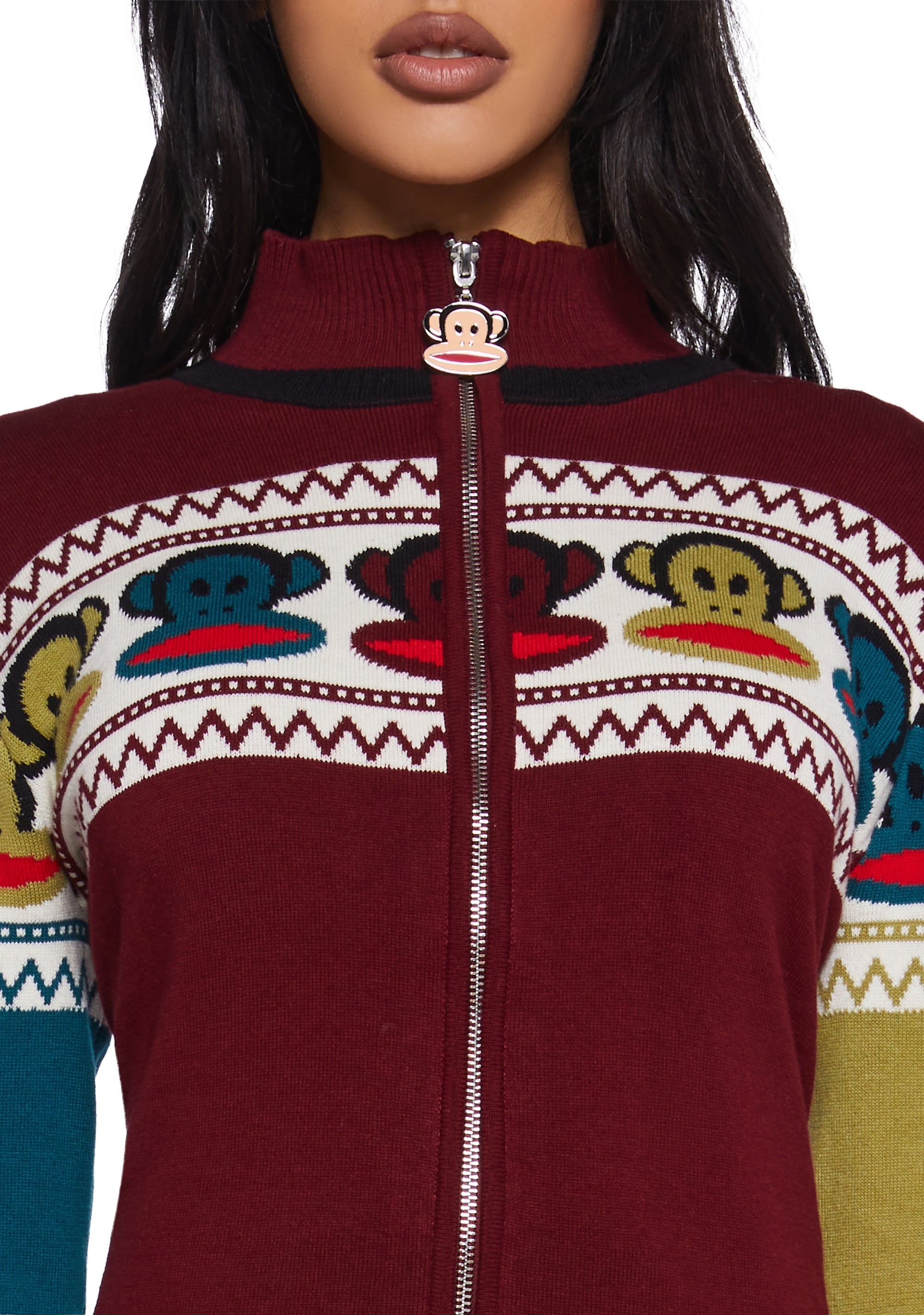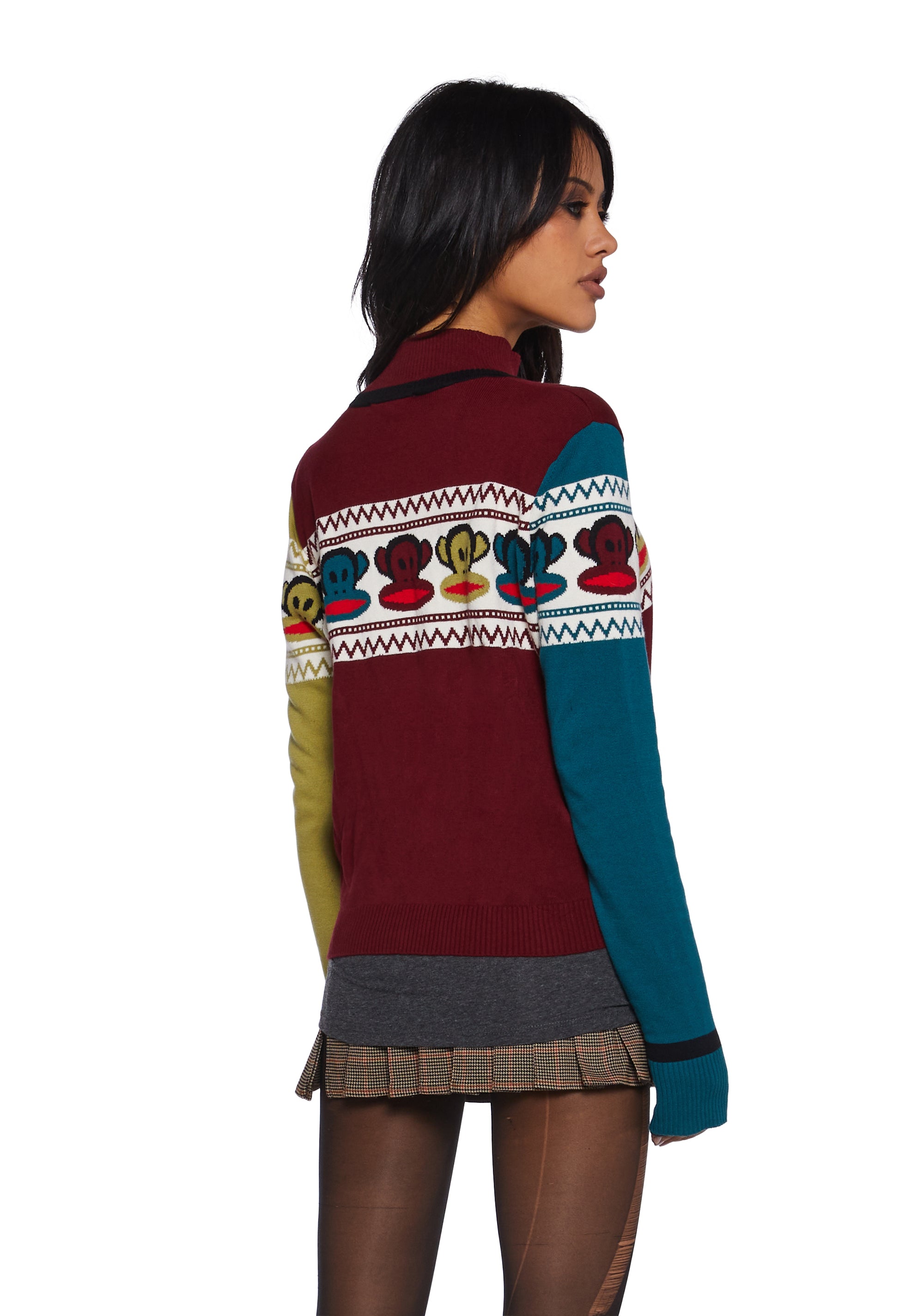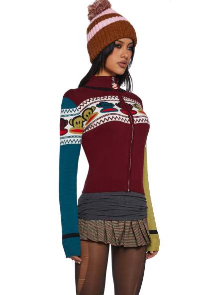 Look totally 90s with this sweater that has a soft knit construction, ribbed collar, cuffs, and hem, an intarsia design of Julius on the front and back, a color block design, long sleeves, and a front zipper closure with an enamel Julius charm.