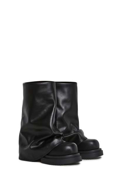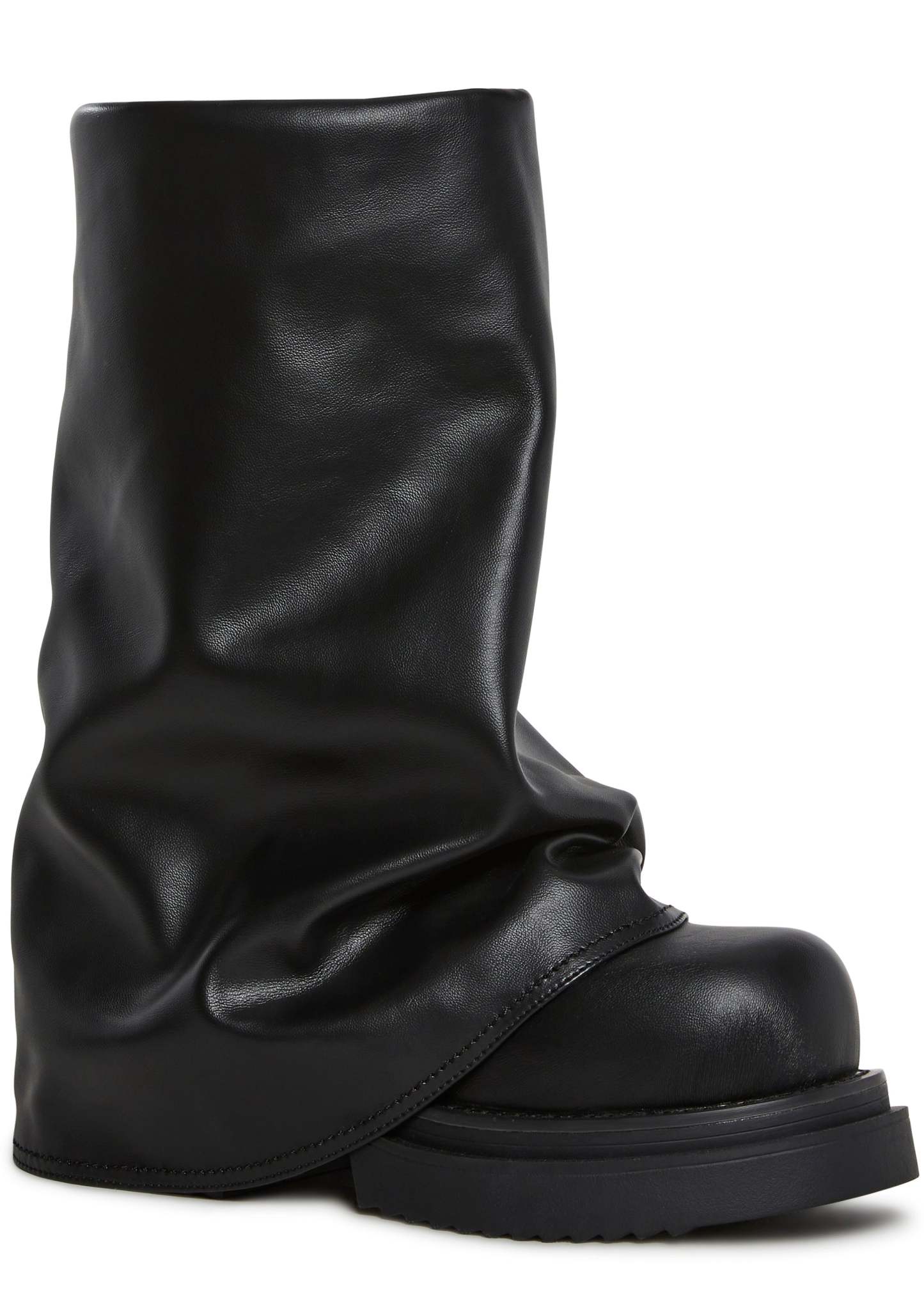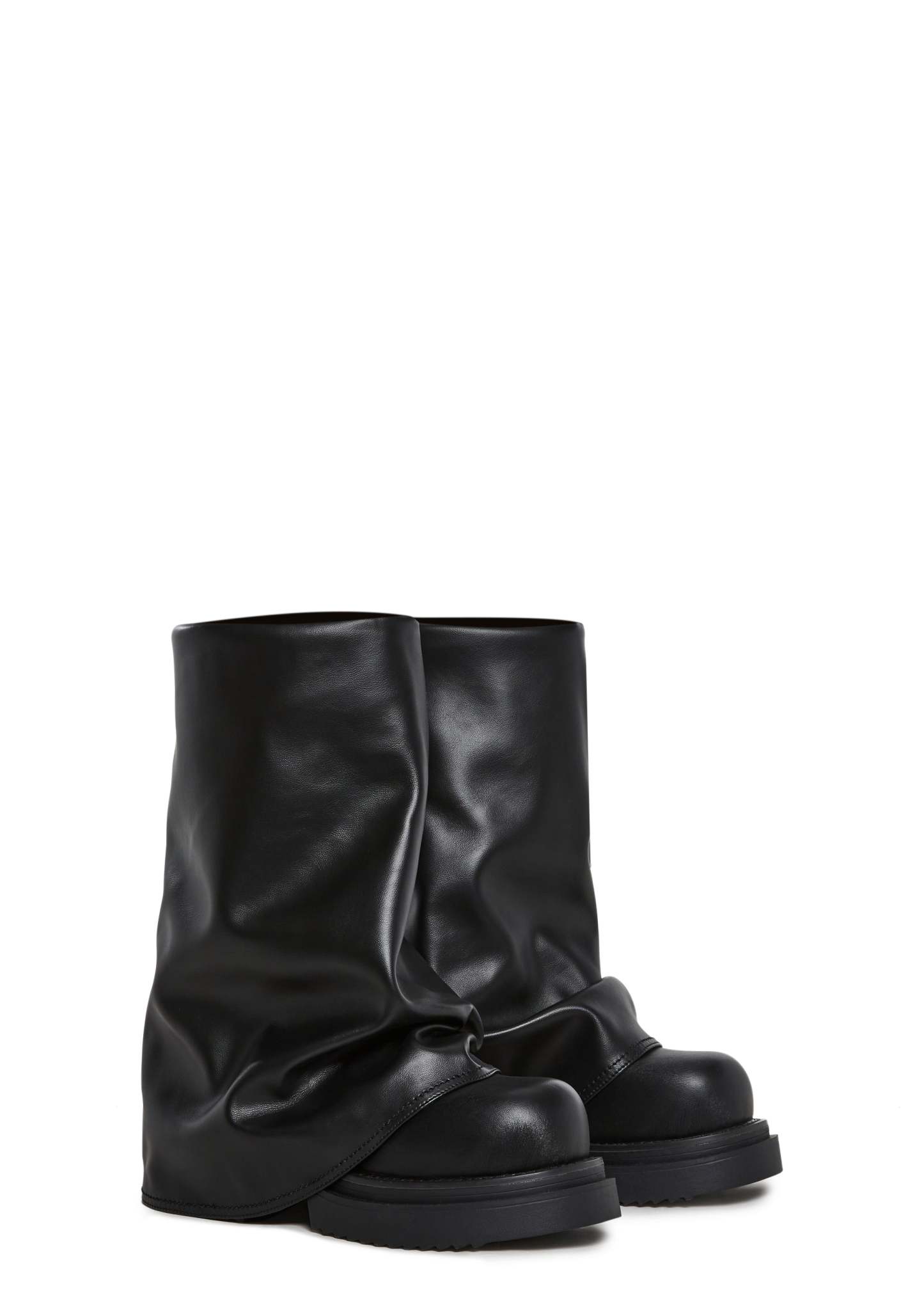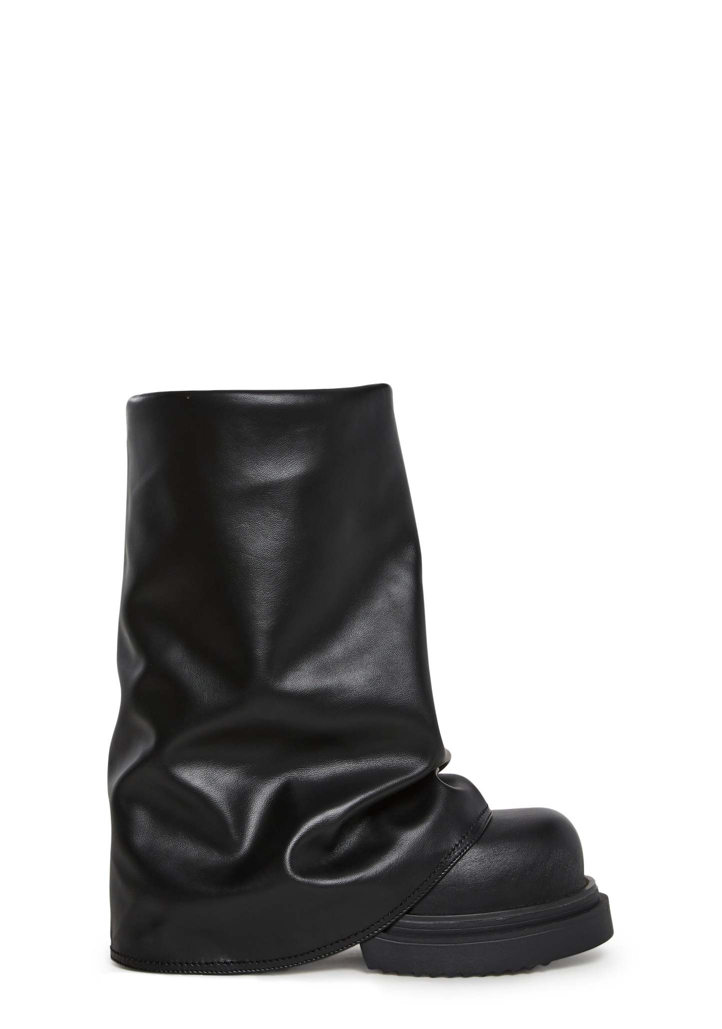 Step up your street style with the Ego Foldover Boots. Made from smooth vegan leather, these bold boots feature a unique foldover design, round toe, and easy slip-on fit, the perfect mix of edgy and effortless.Details:Vegan leather constructionFoldover silhouetteRound toeSlip-on designChunky rubber sole for comfort and gripStyle it with:Pair them with an oversized hoodie dress or a mini skirt and bomber jacket for a bold, fashion-forward look.