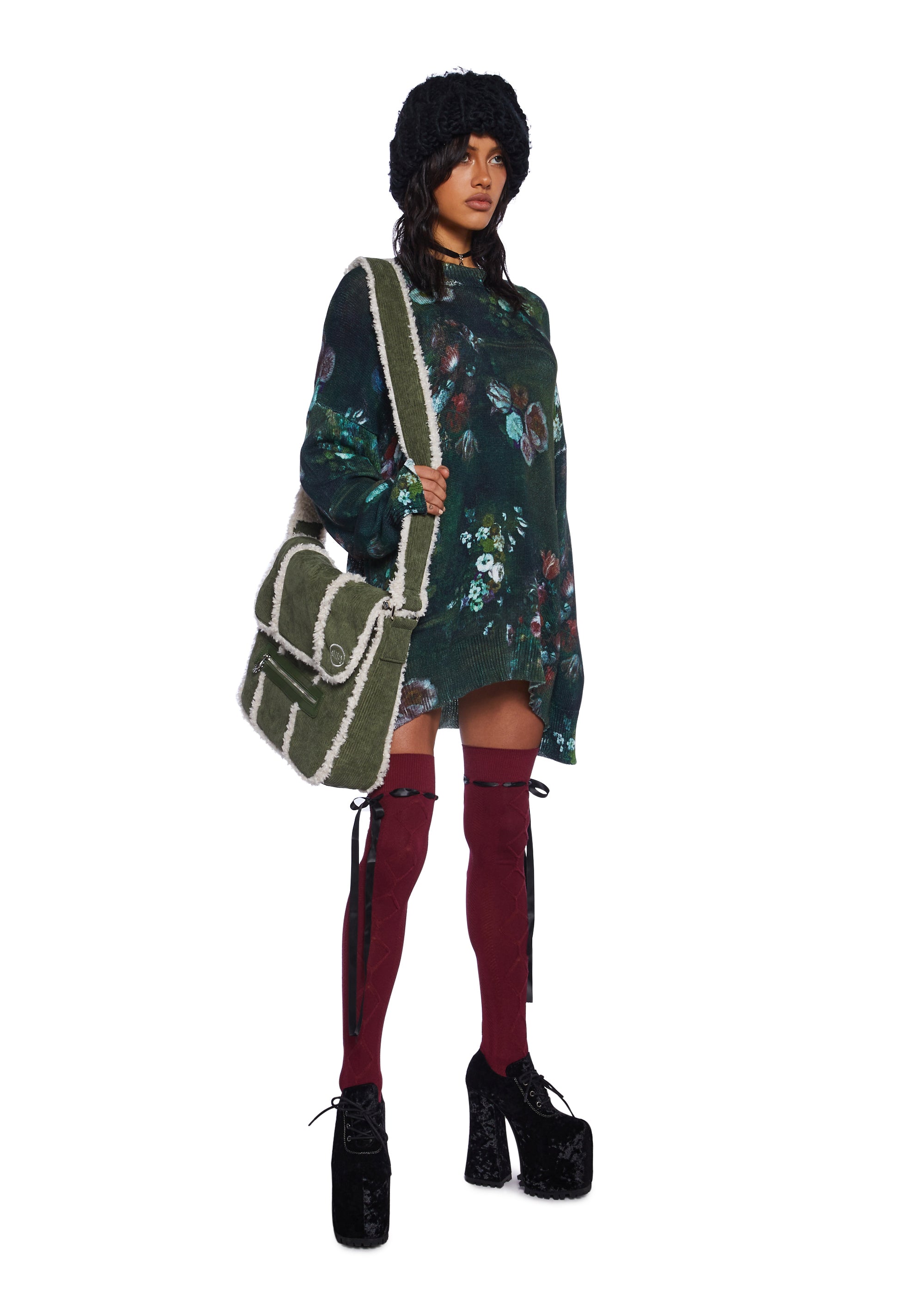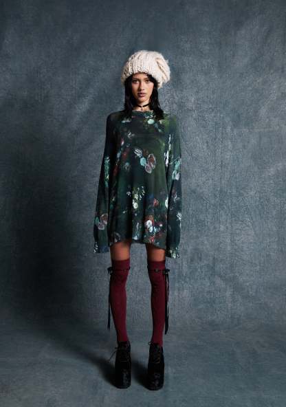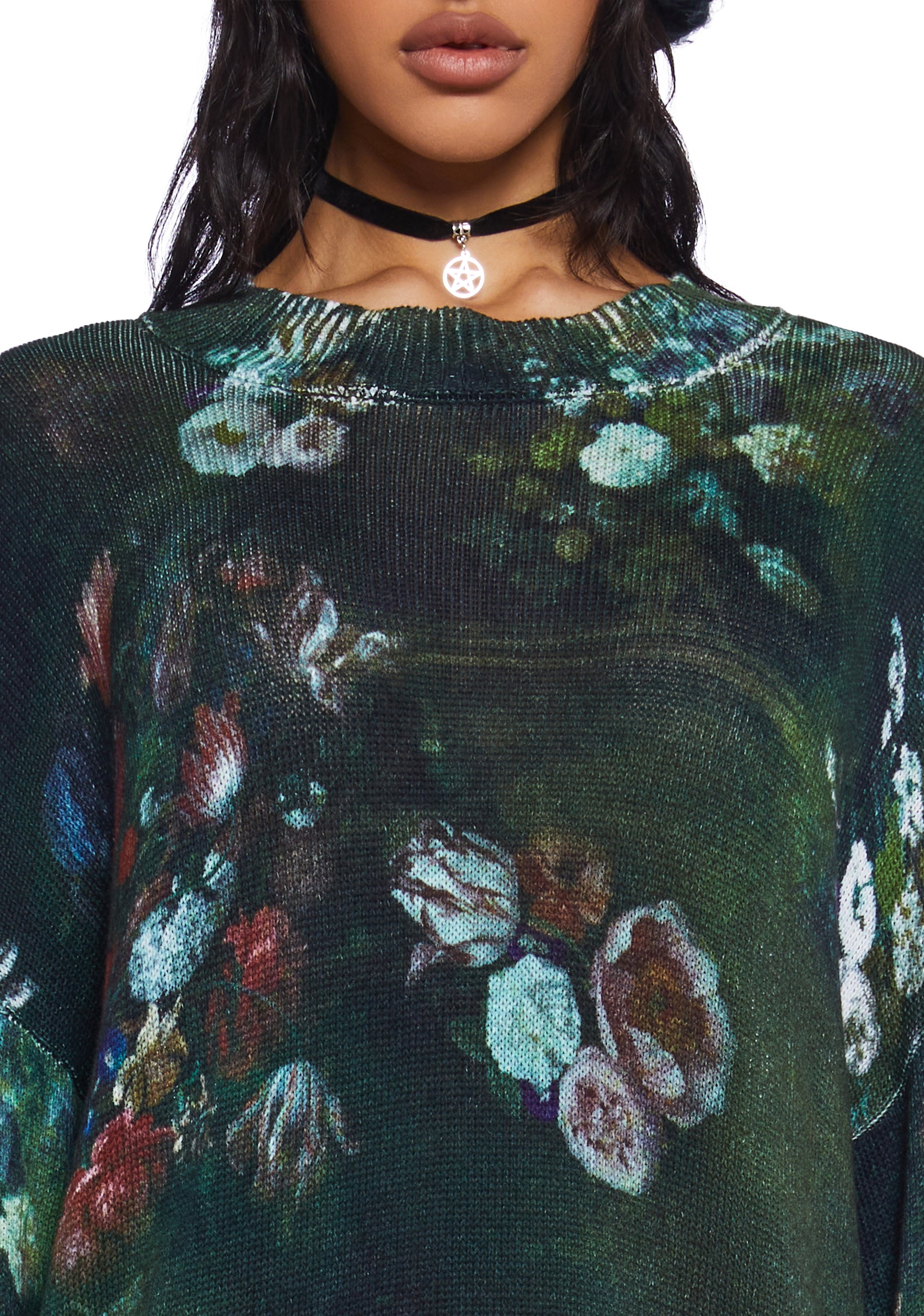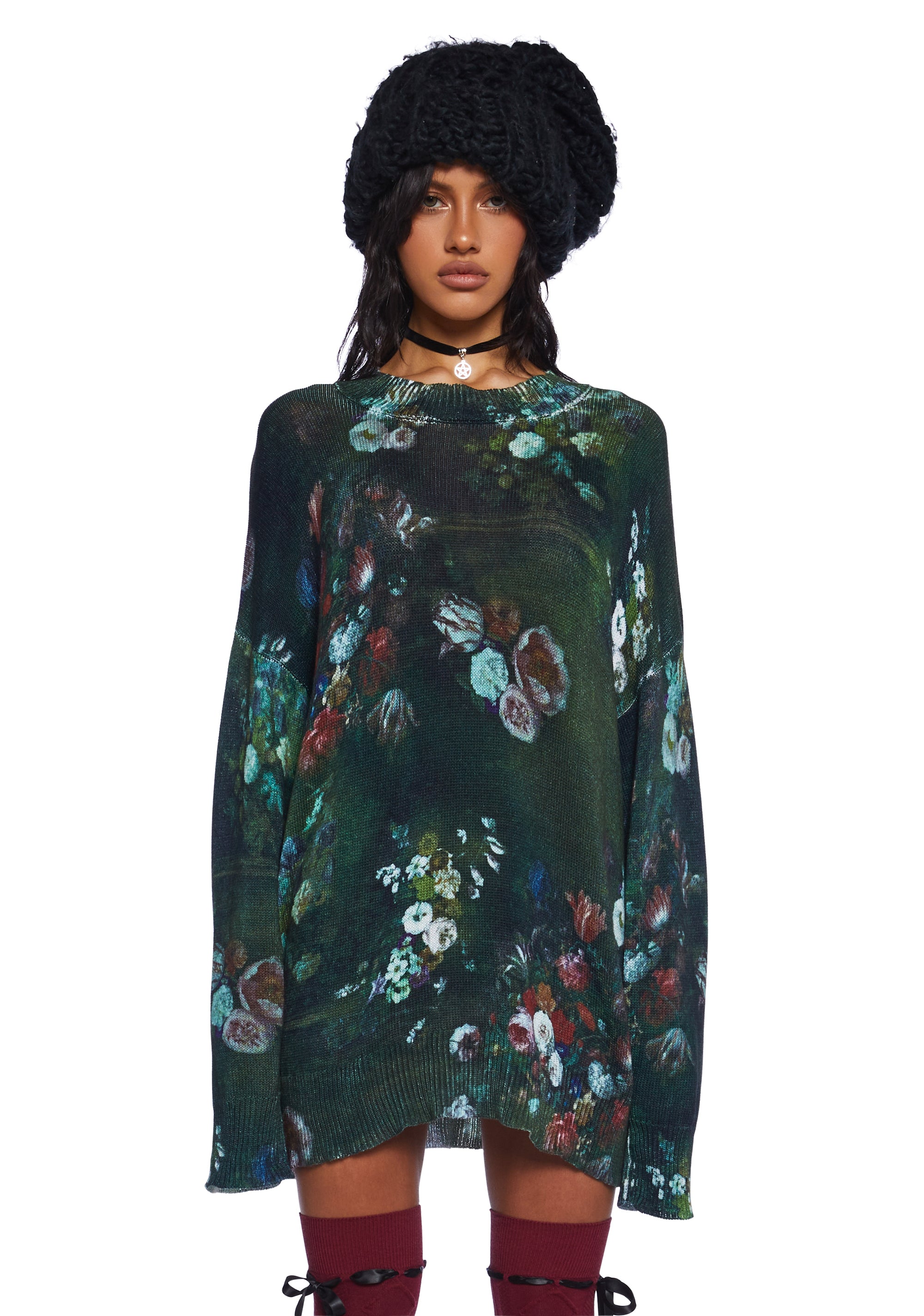 This oversized sweater has a stretchy knit construction, an all-over floral art print, and a ribbed crew neckline, hem, and cuffs.
