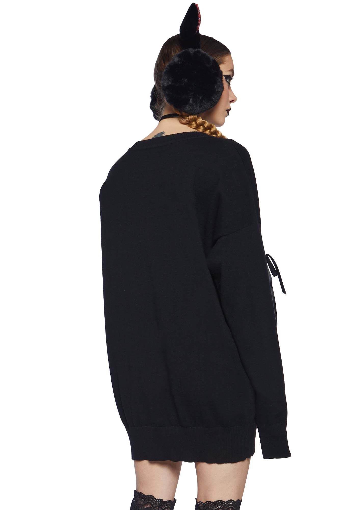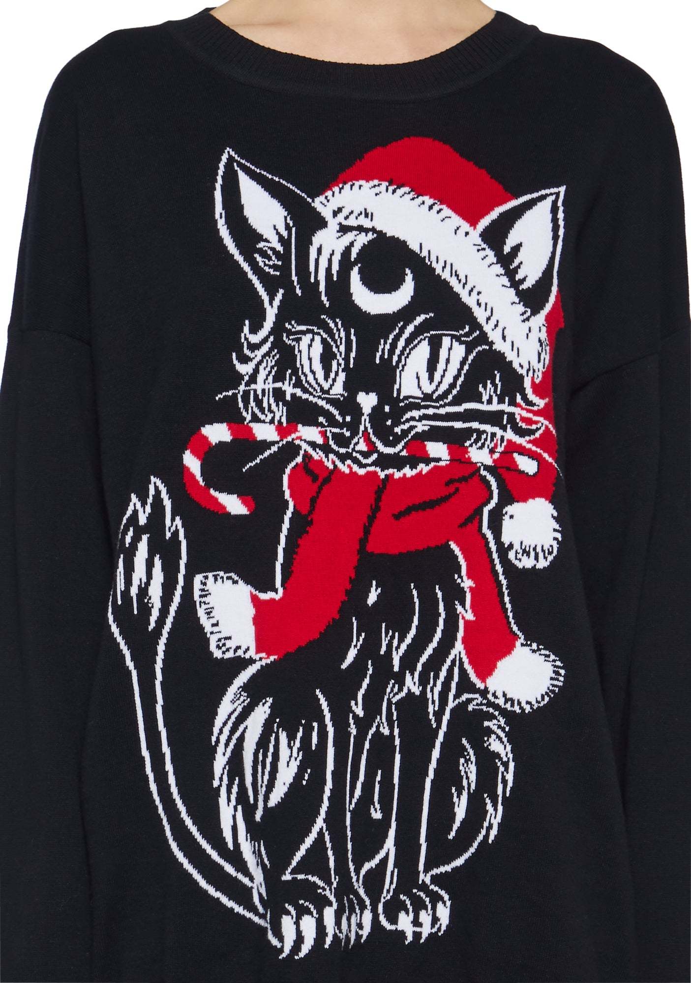 cuz a kitty for the holidays? This sweater has a knit construction, a crew neckline, long sleeves, and an intarsia print of Star the cat as Santa on the front.