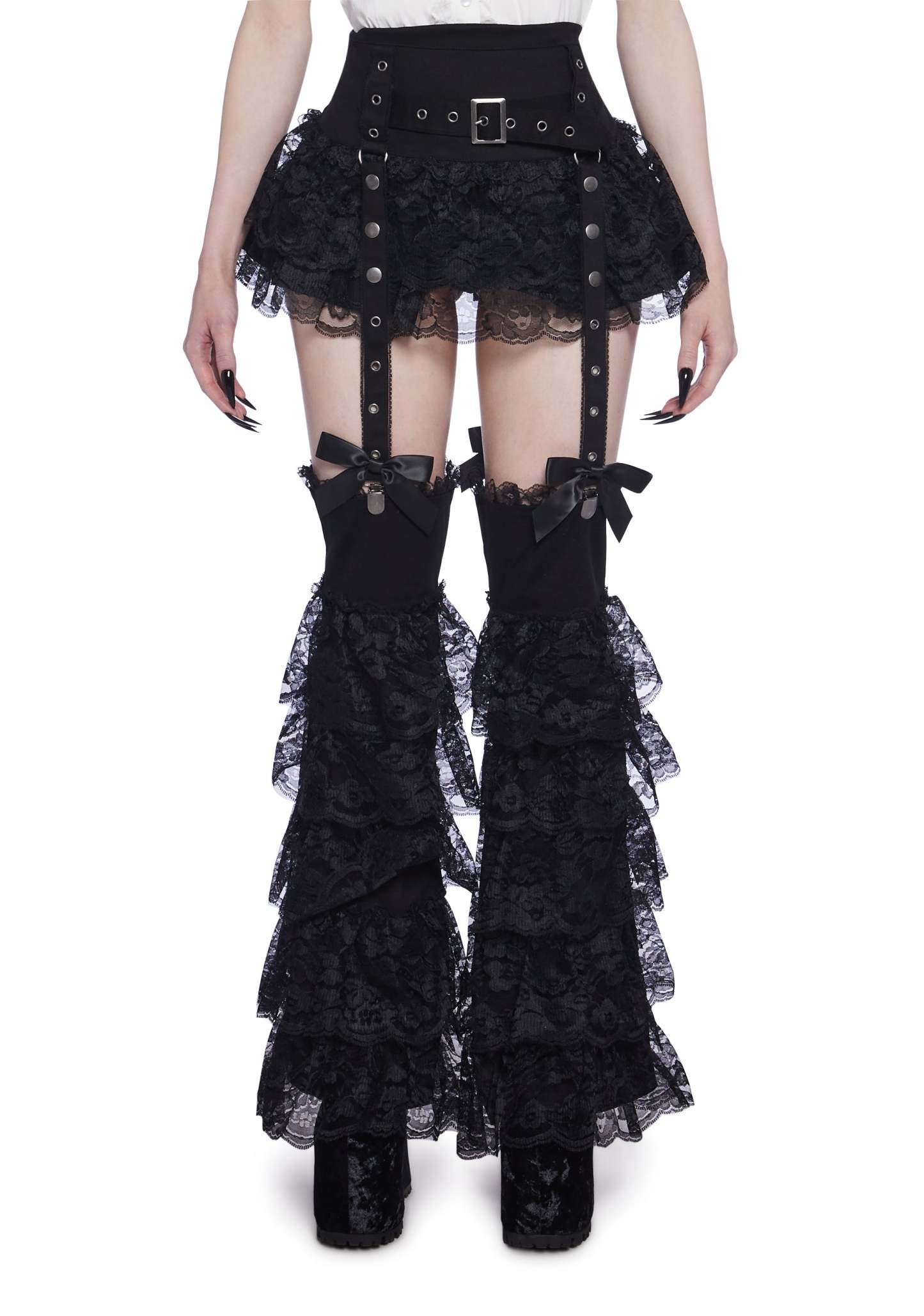 cuz they have an obsession. This mini skirt has a twill construction with attached garters, detachable ruffled lace leg warmers, ruffled lace detailing, d-ring hardware, satin bow appliques, grommet detailing, a front belt buckle design, and a back zipper closure.