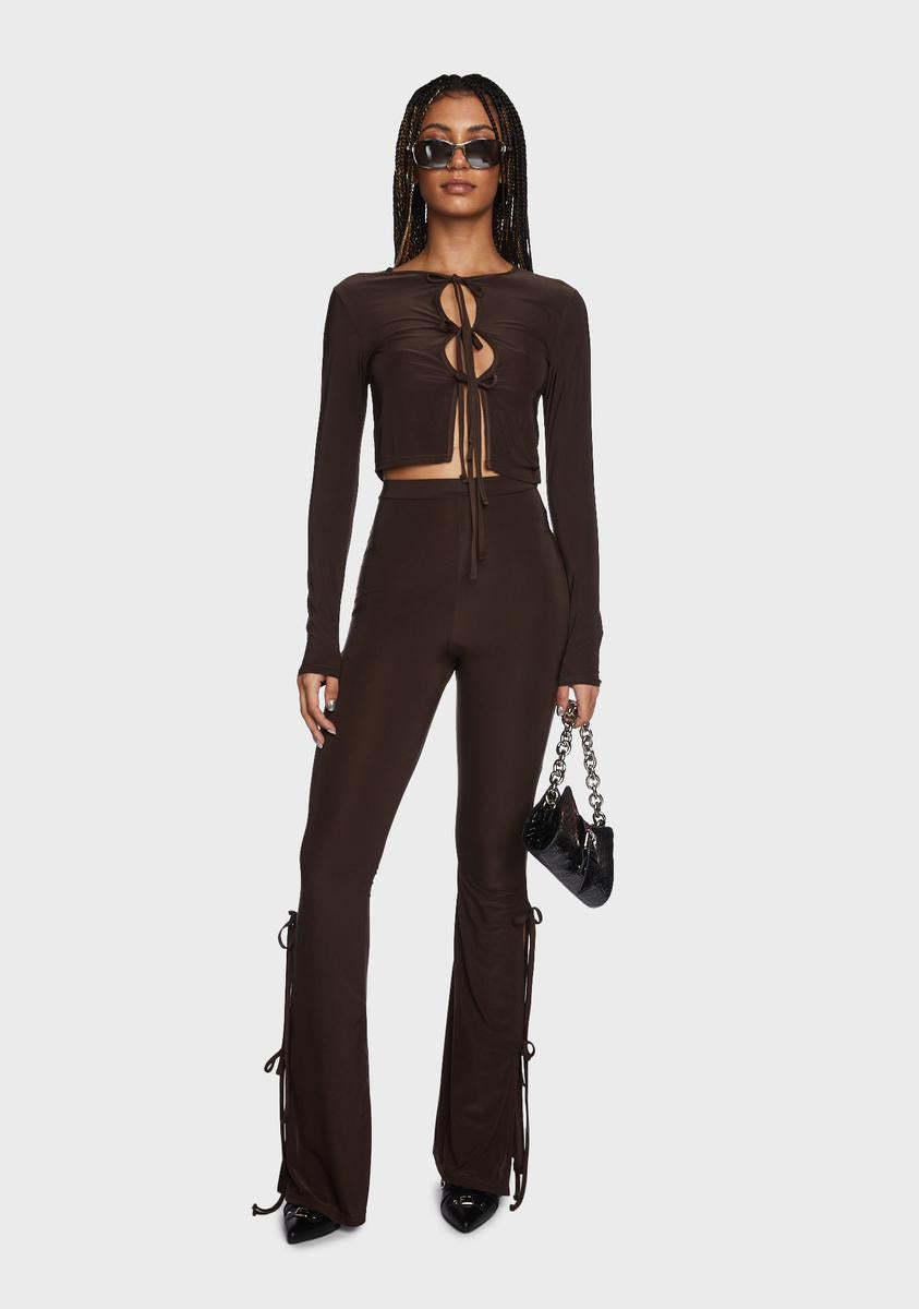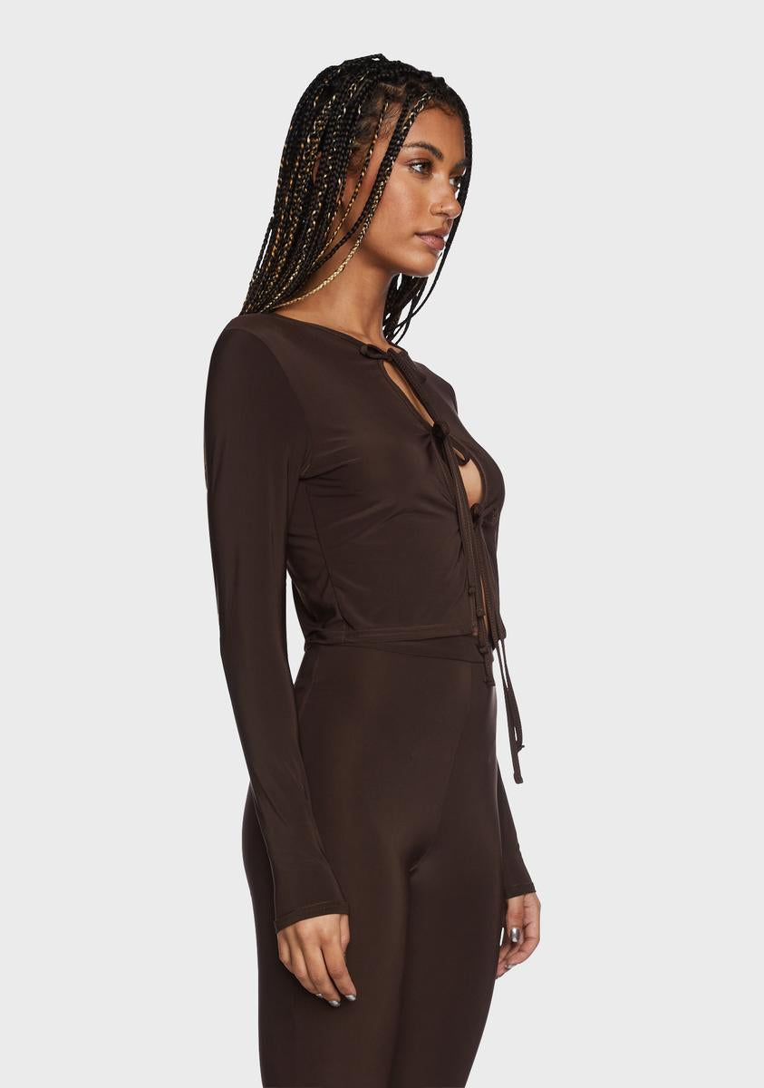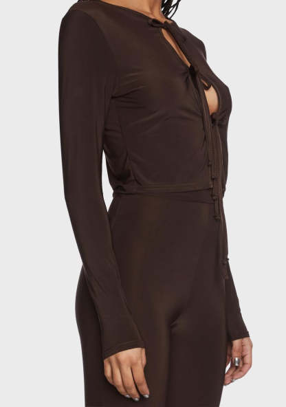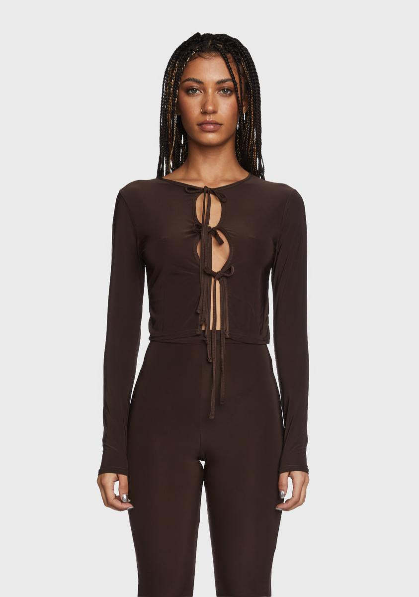 got 'em in the DMs. This cropped top has cutouts at front with adjustable ties and long sleeves.