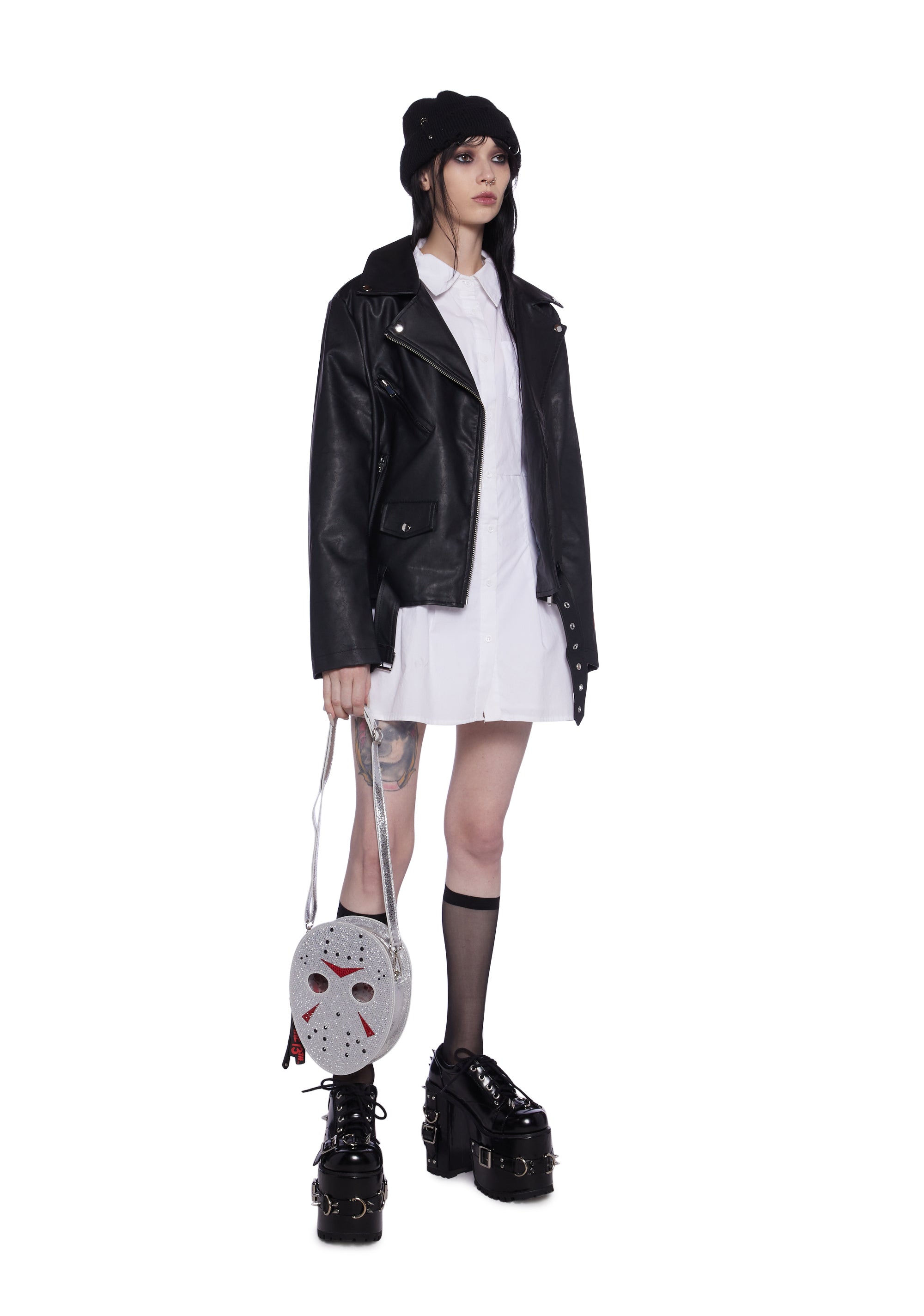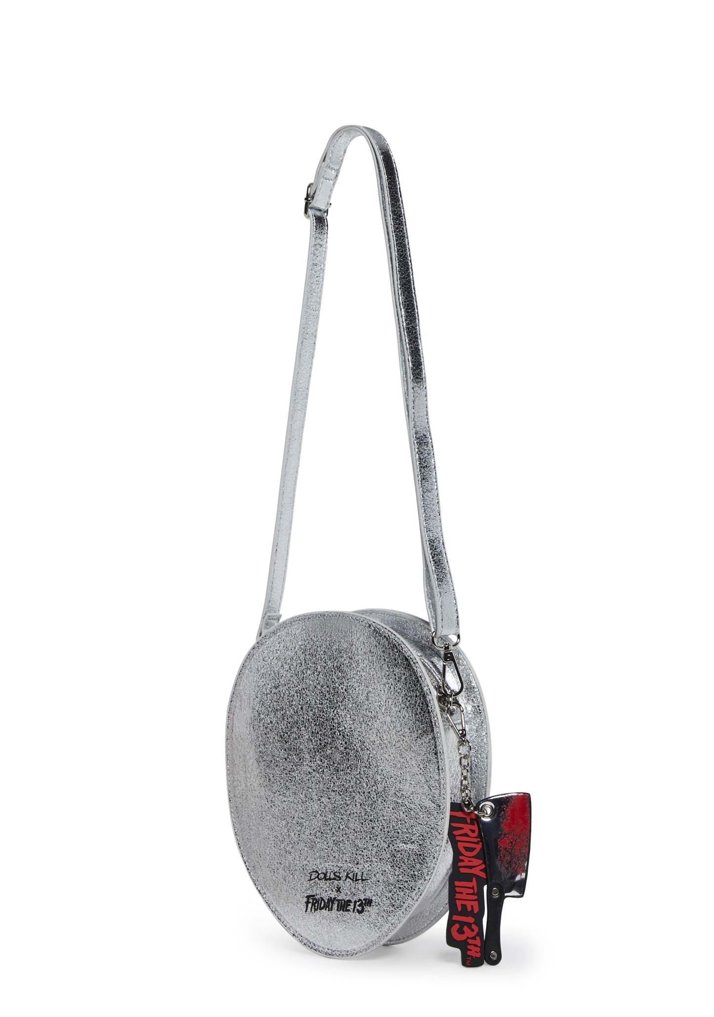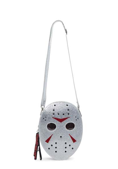 Flaunt your slasher film fandom with this crossbody bag, shaped like Jason’s mask, with a metallic vegan leather construction, adorned with rhinestones, clear PVC on the eyes of the mask, an adjustable and removable shoulder strap, a removable chain shoulder strap adorned with rhinestones, a removable knife keychain, and a top zipper closure.