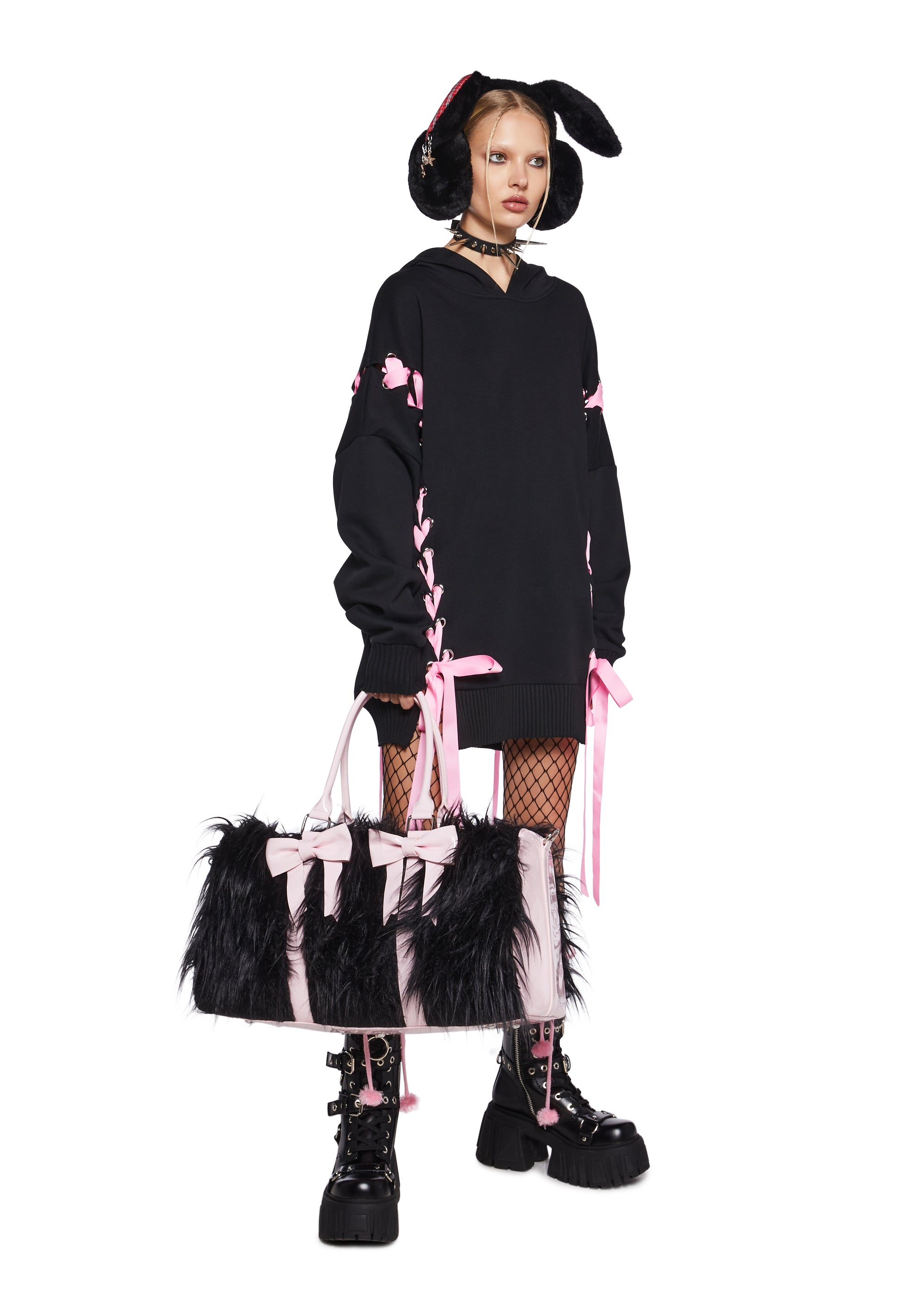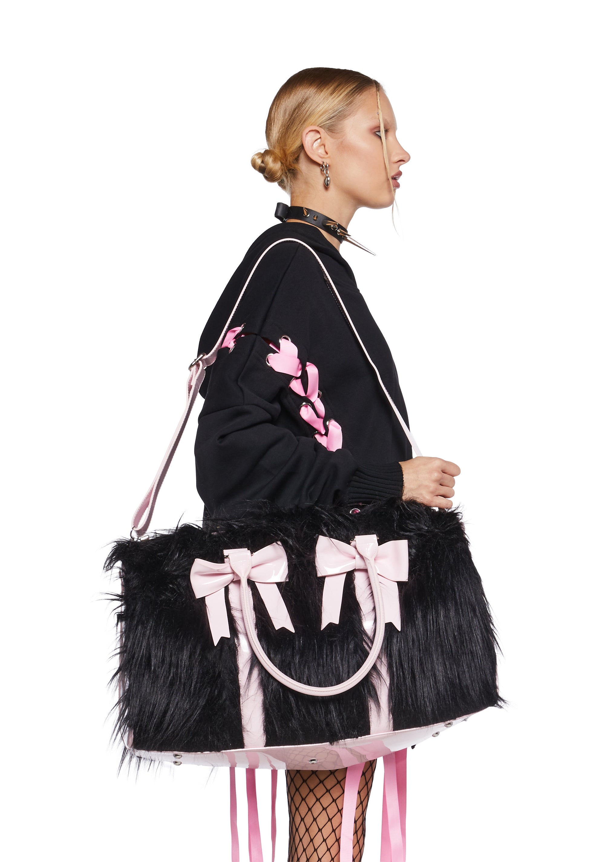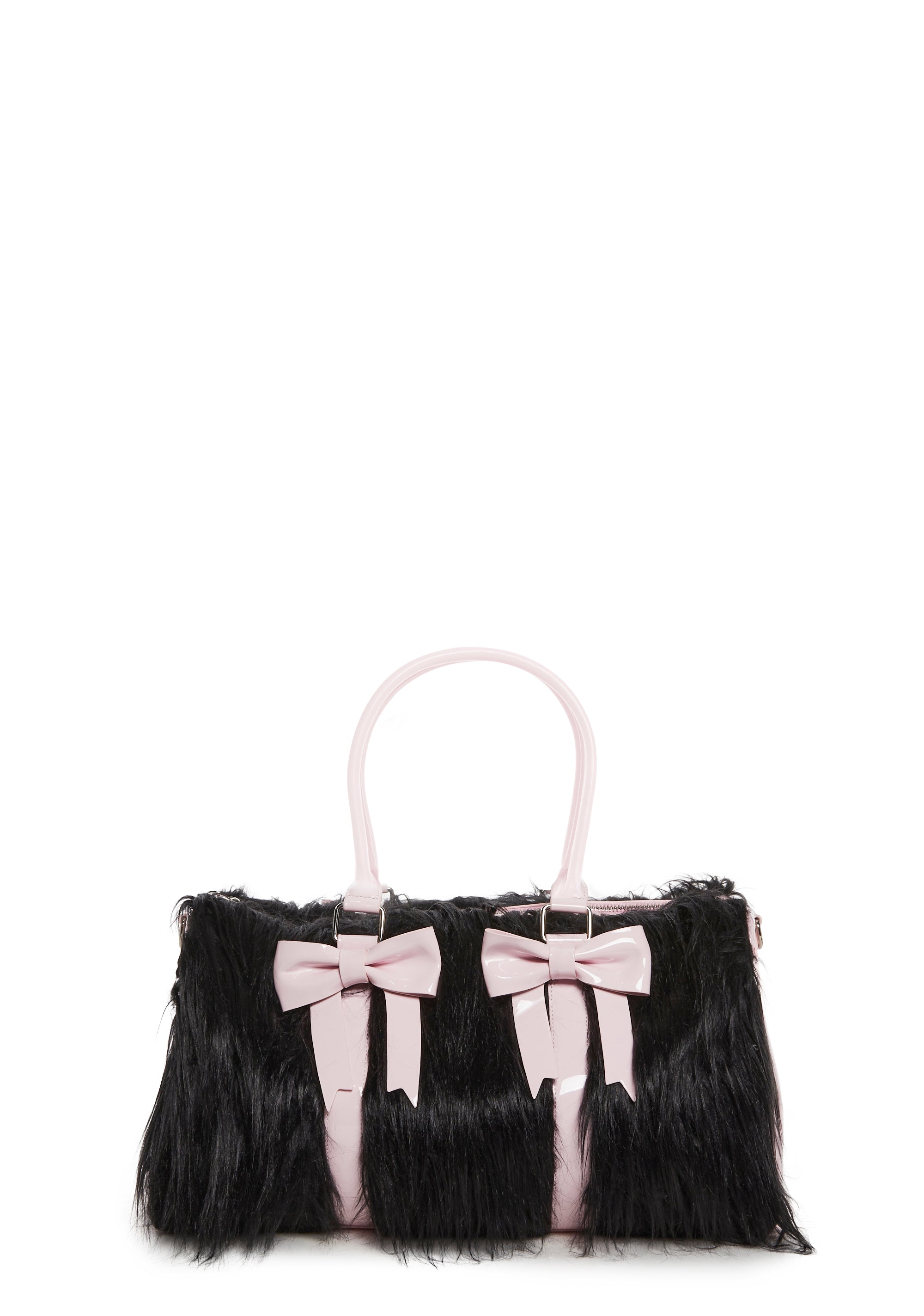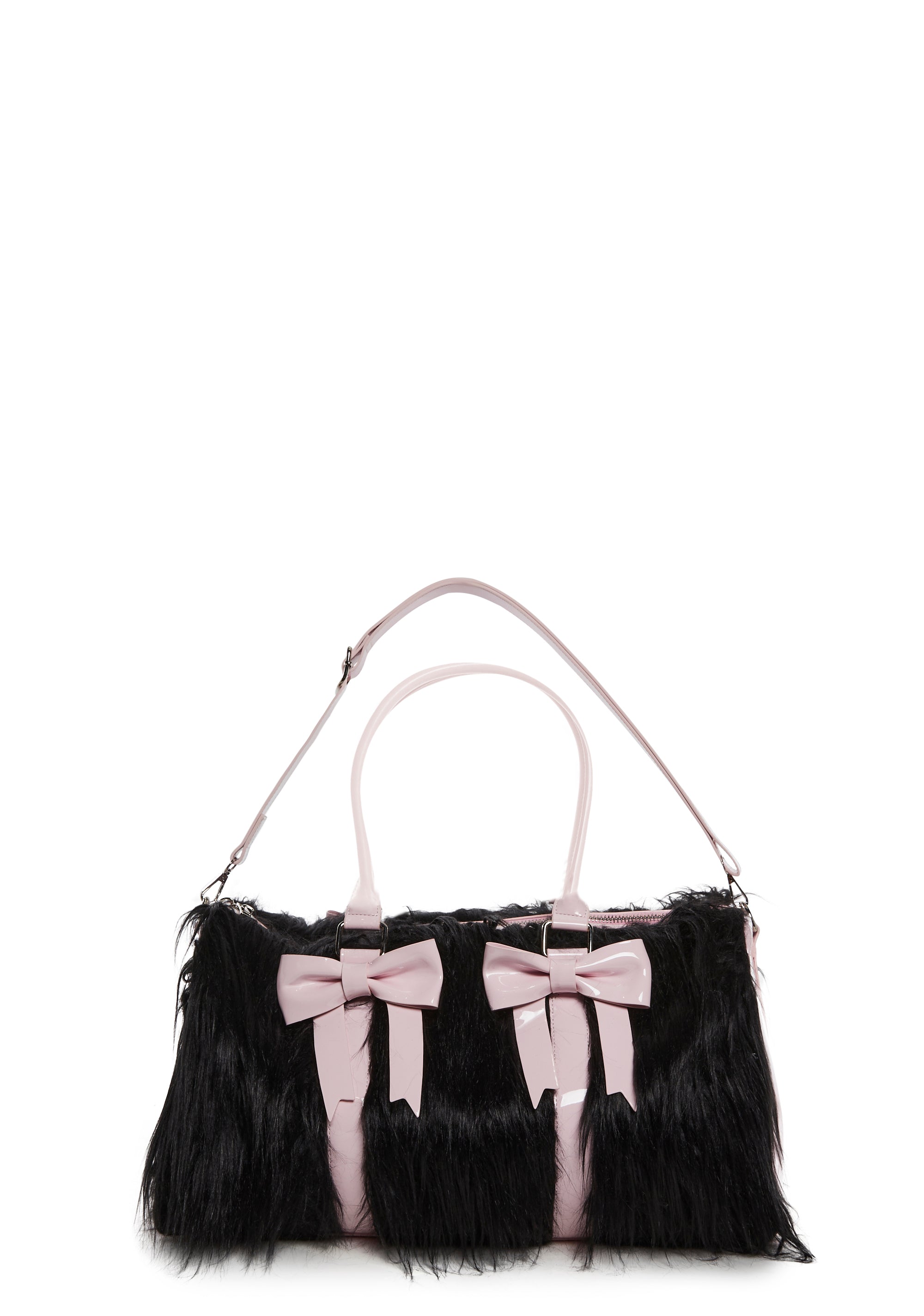 first you're sinful, then you're sweet. This weekender bag comes in a faux fur construction, with patent trim details, bow shaped accents, top carrying handles, a long detachable shoulder strap, and a top zipper closure.