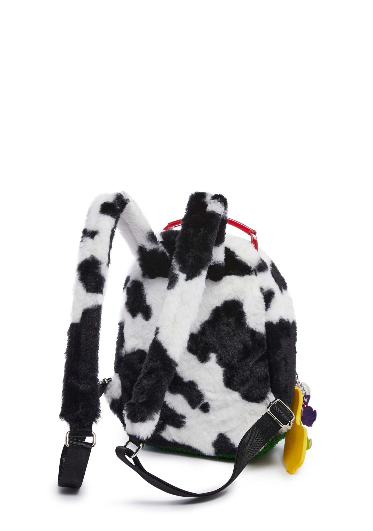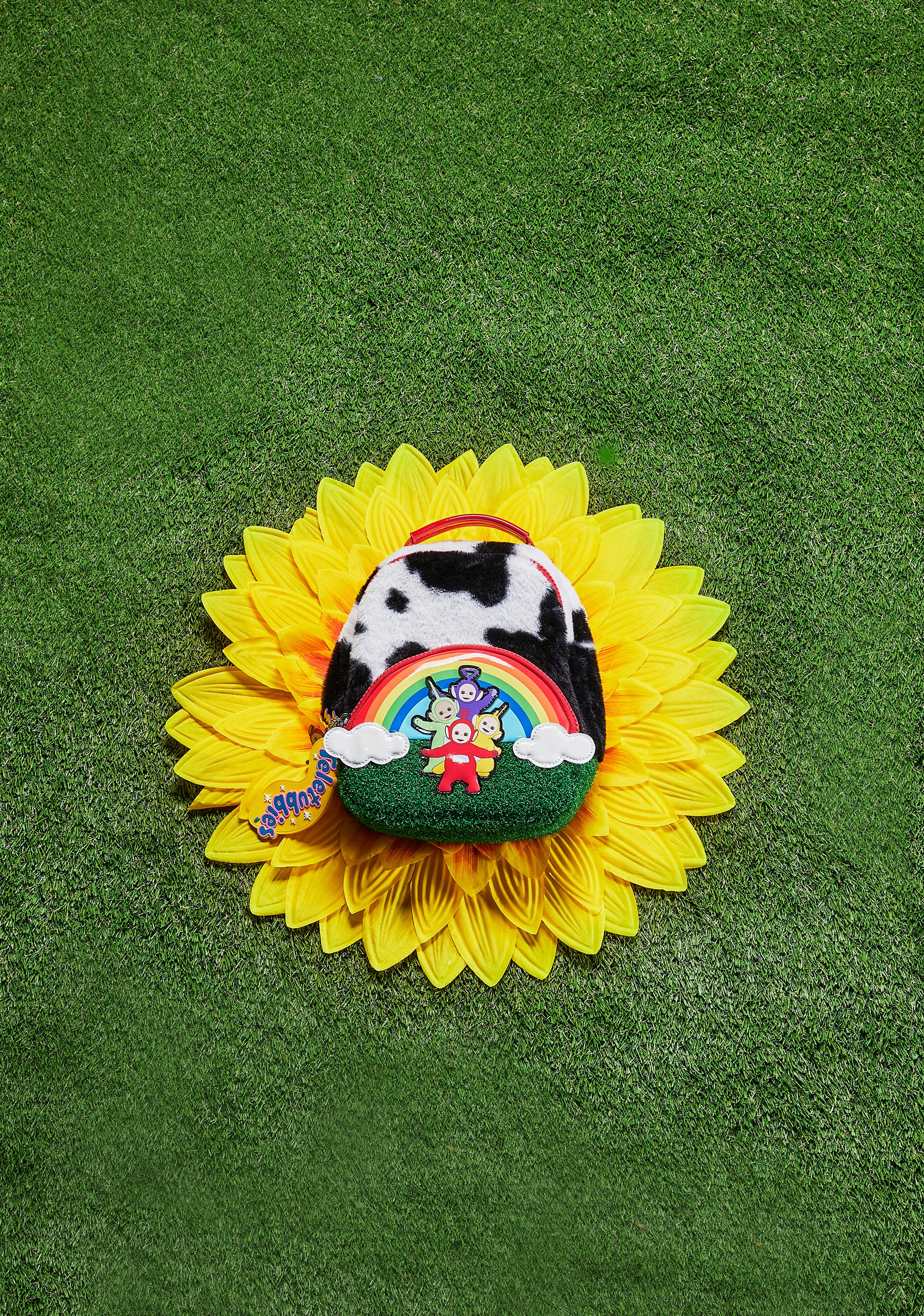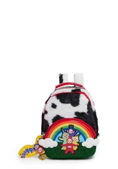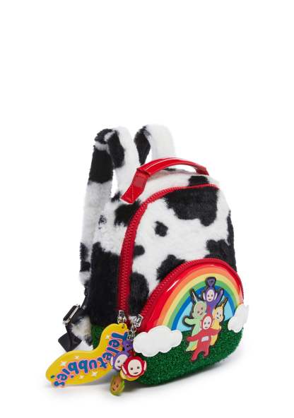 cuz remember? This mini backpack has a faux fur construction on top, a cow print, a grass turf bottom, a front pocket shaped like a rainbow with Teletubbies and cloud appliques, a vinyl red top handle, adjustable faux fur cow print shoulder straps, a top zipper closure, and removable key chain with rubber Teletubbies logo and metal character charms.