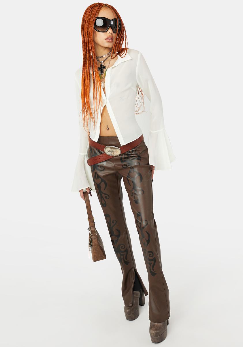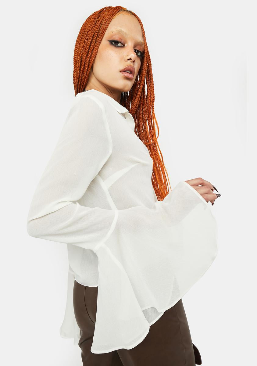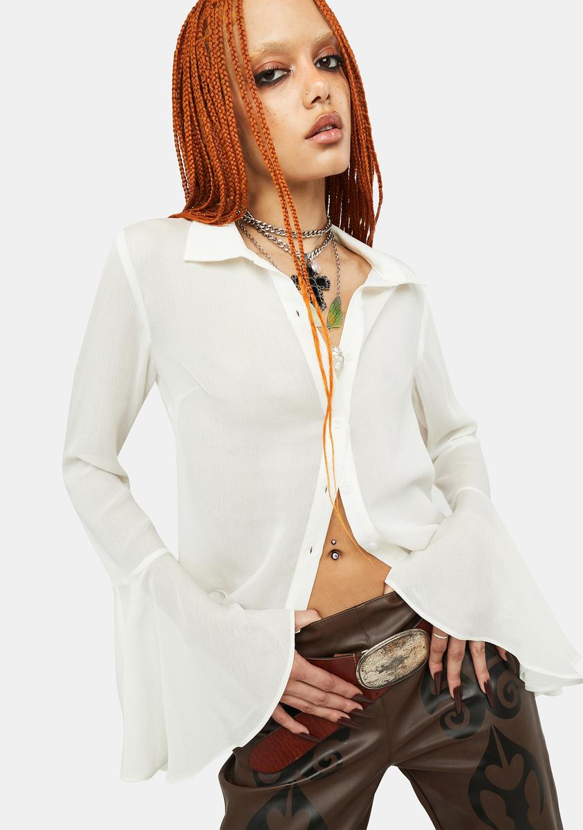 because dreams really do come true. Adventure happens in this blouse with a collar, long bell sleeves, a chiffon construction, and buttons up the front.