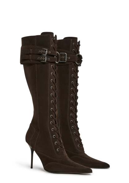 Cast a spell with the Total Bewitcher Lace-Up Boots, crafted from faux suede for a luxe, sultry look. Featuring a pointed toe, stiletto heel, front lace-up design, and adjustable buckle straps with O-ring hardware, these boots deliver fierce sophistication. Complete with a side zipper closure for easy wear.