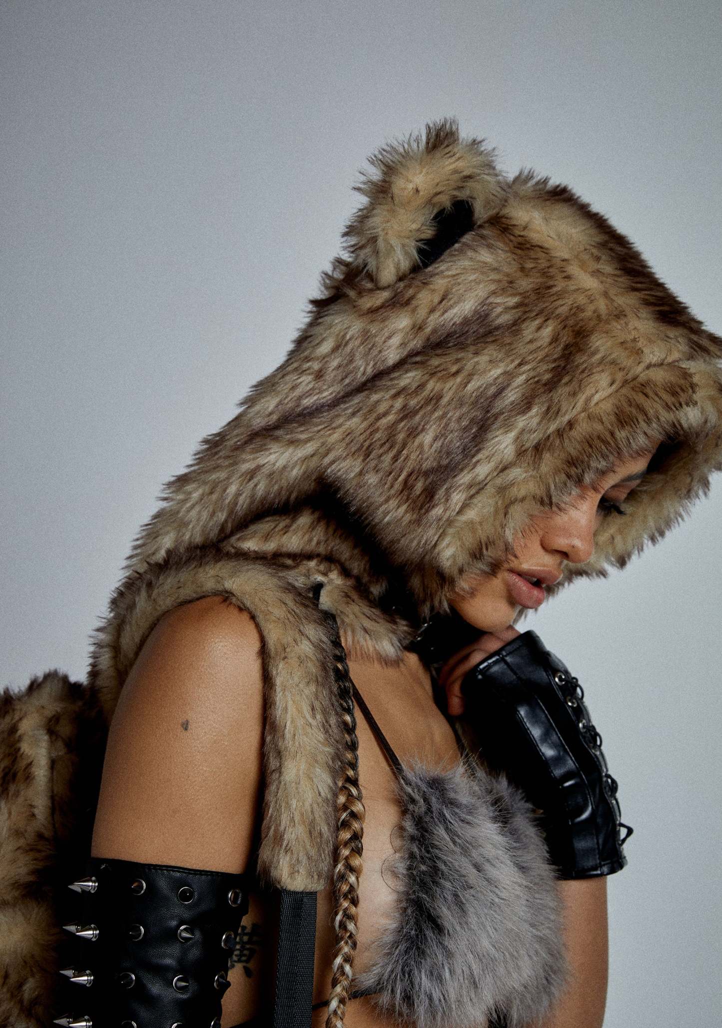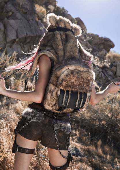 cuz no one can tame you. This backpack has a faux fur construction, a vegan leather trim, a front pocket with a buckle closure, inner zippered pockets, a top zipper closure, and an attached hoodie with bear ears, adjustable vegan buckles, and pom pom drawstring closures.
