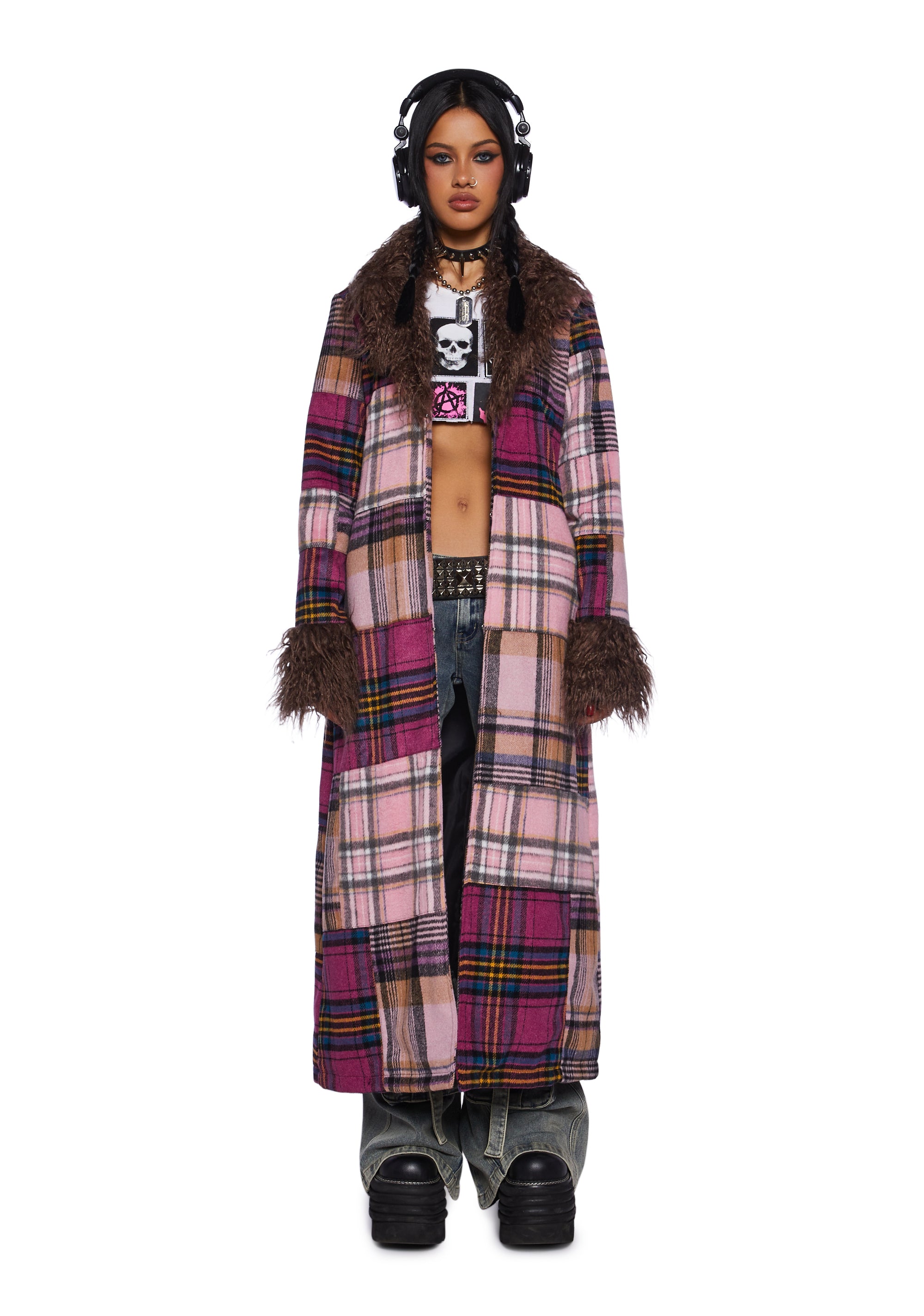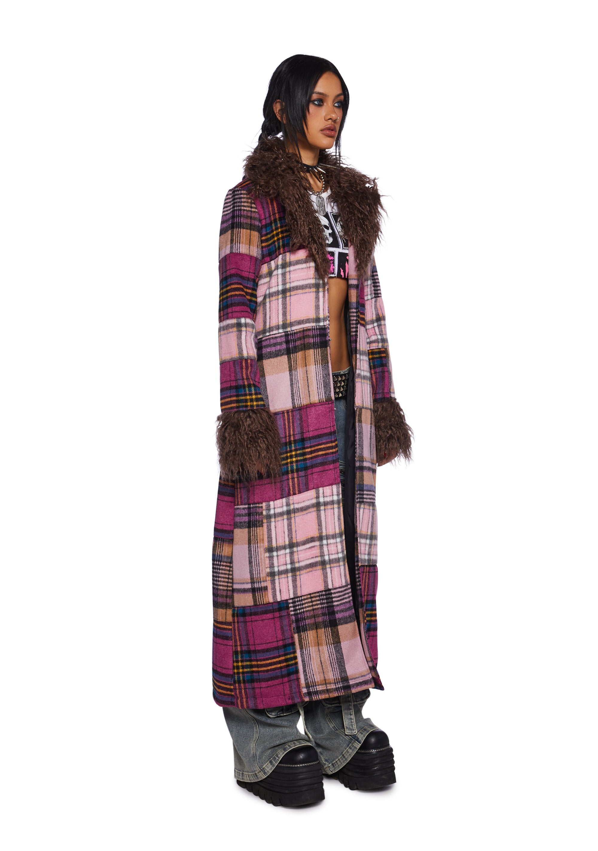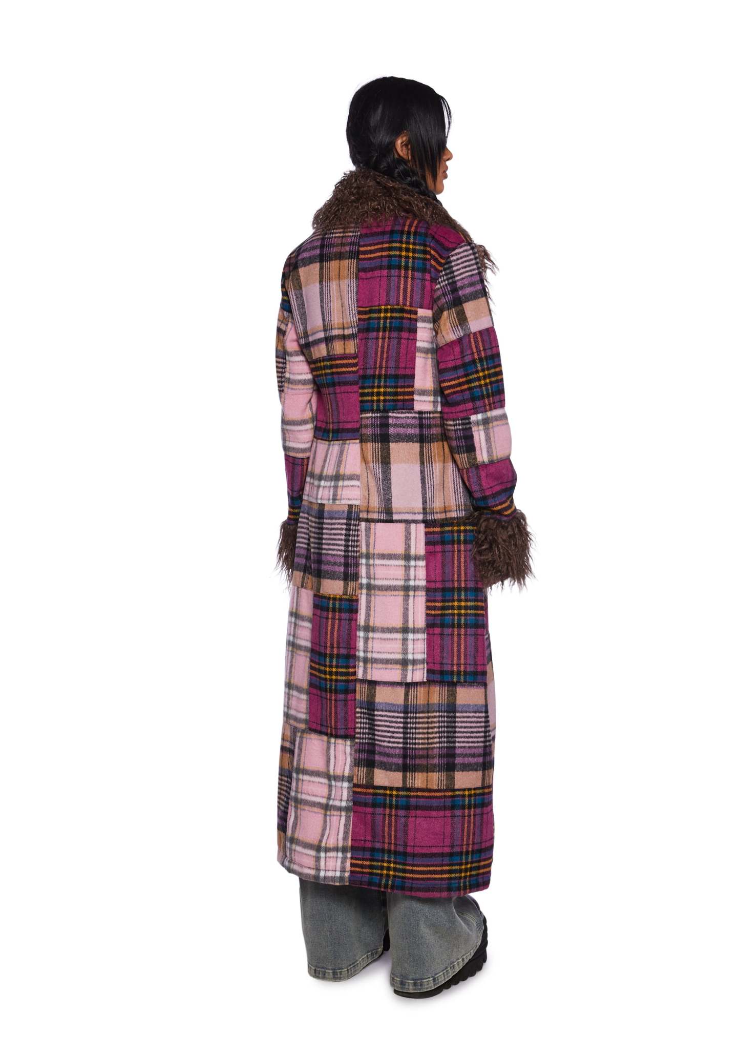 This maxi coat has a velour construction, a patchwork plaid design, a faux fur trim, side pockets, and front hook and eye closures.