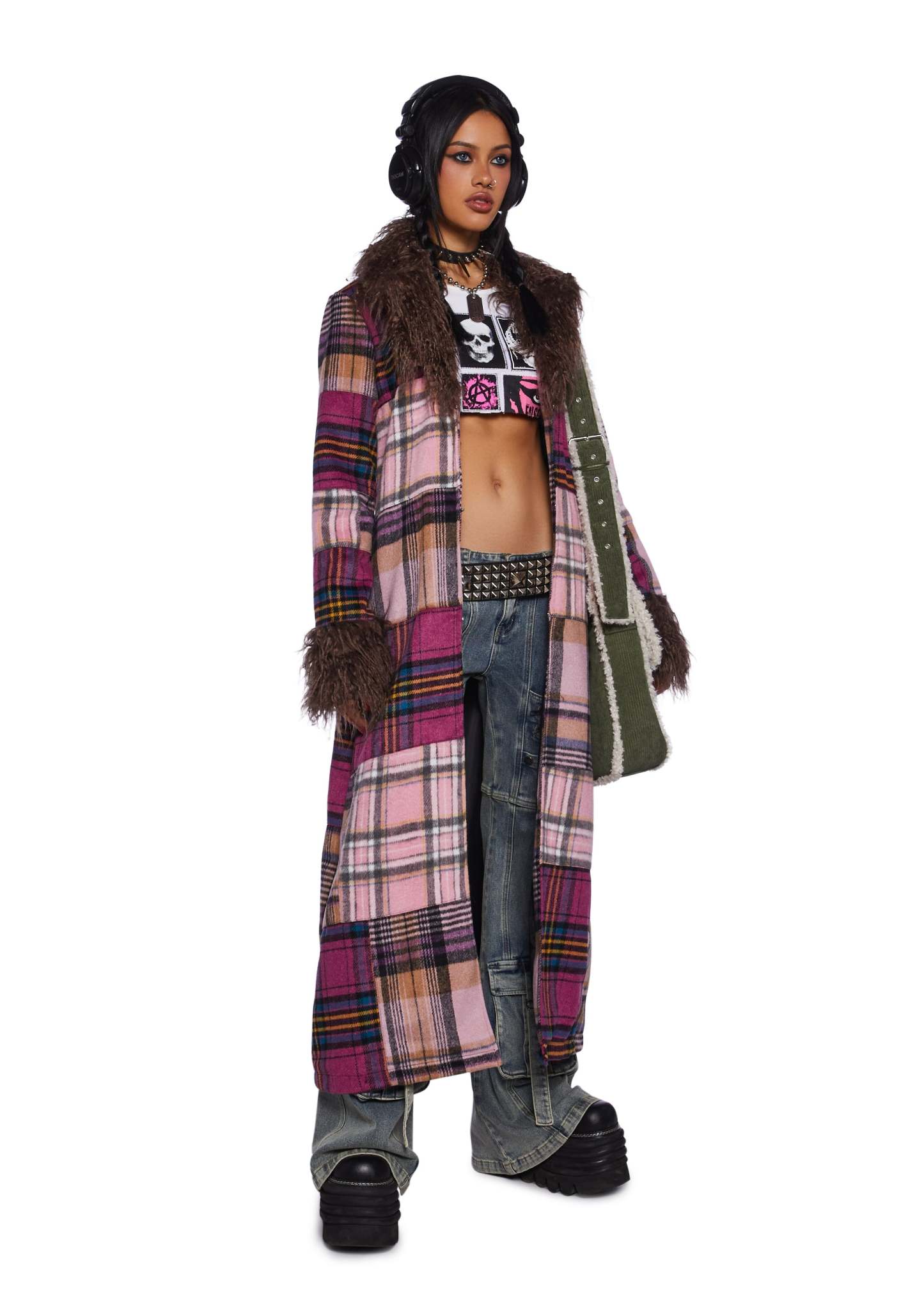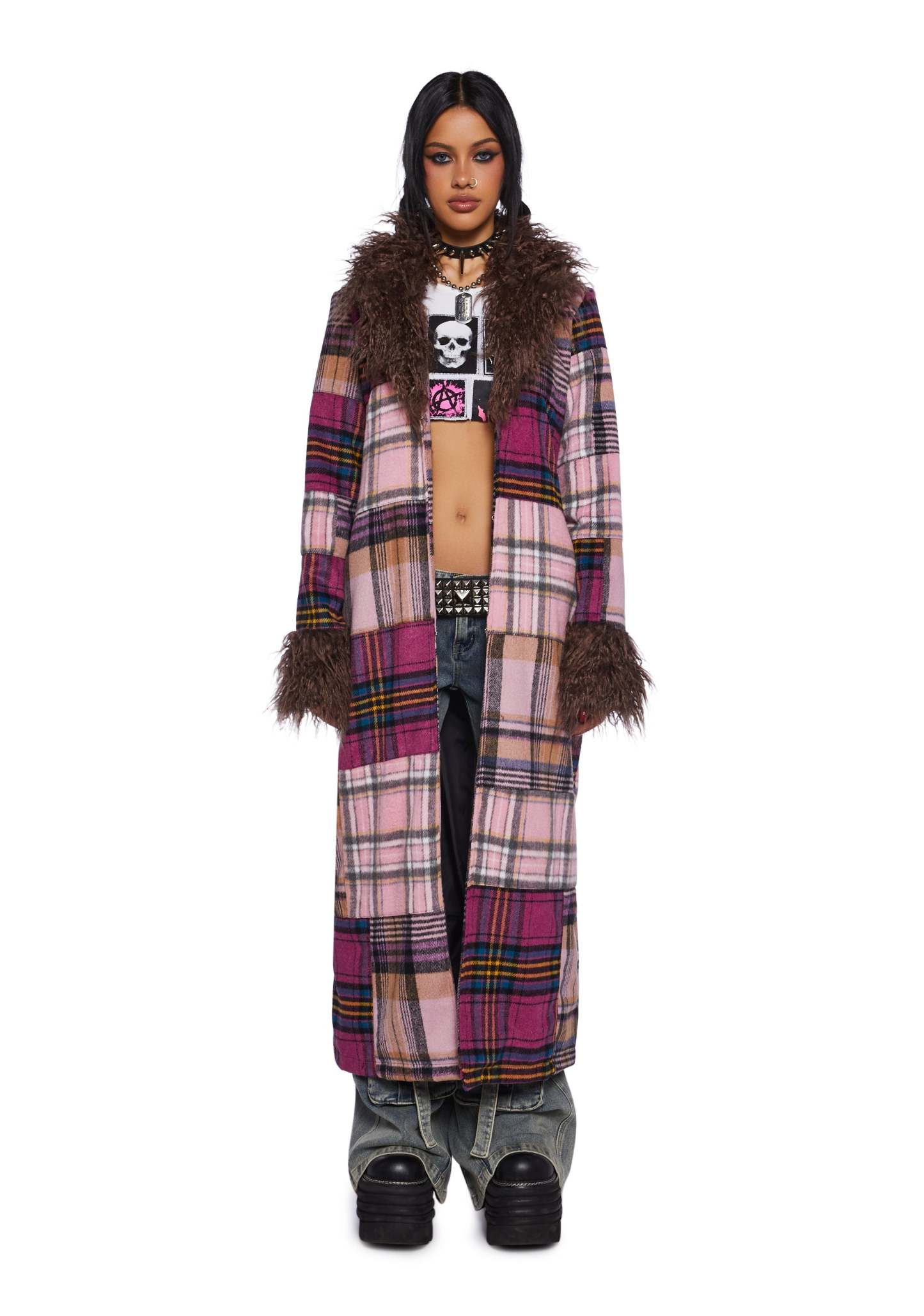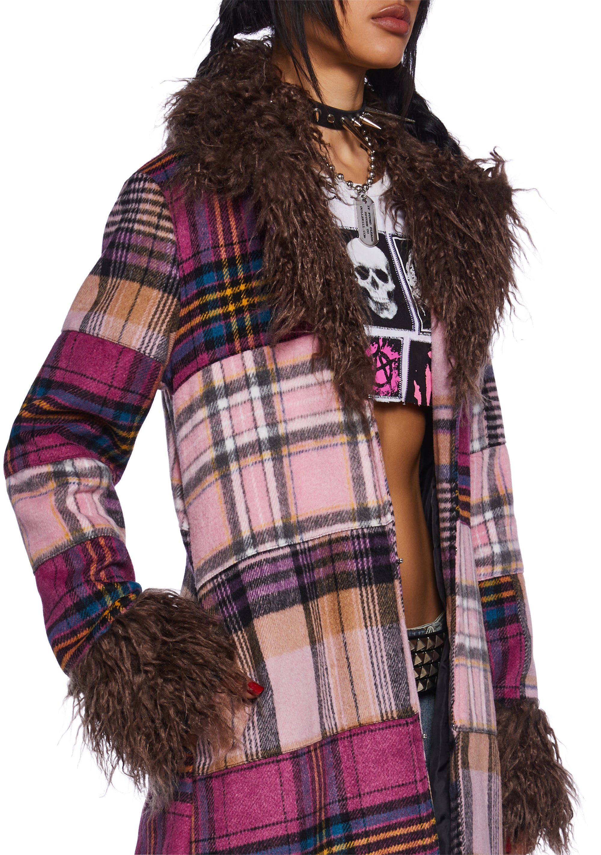 This maxi coat has a velour construction, a patchwork plaid design, a faux fur trim, side pockets, and front hook and eye closures.