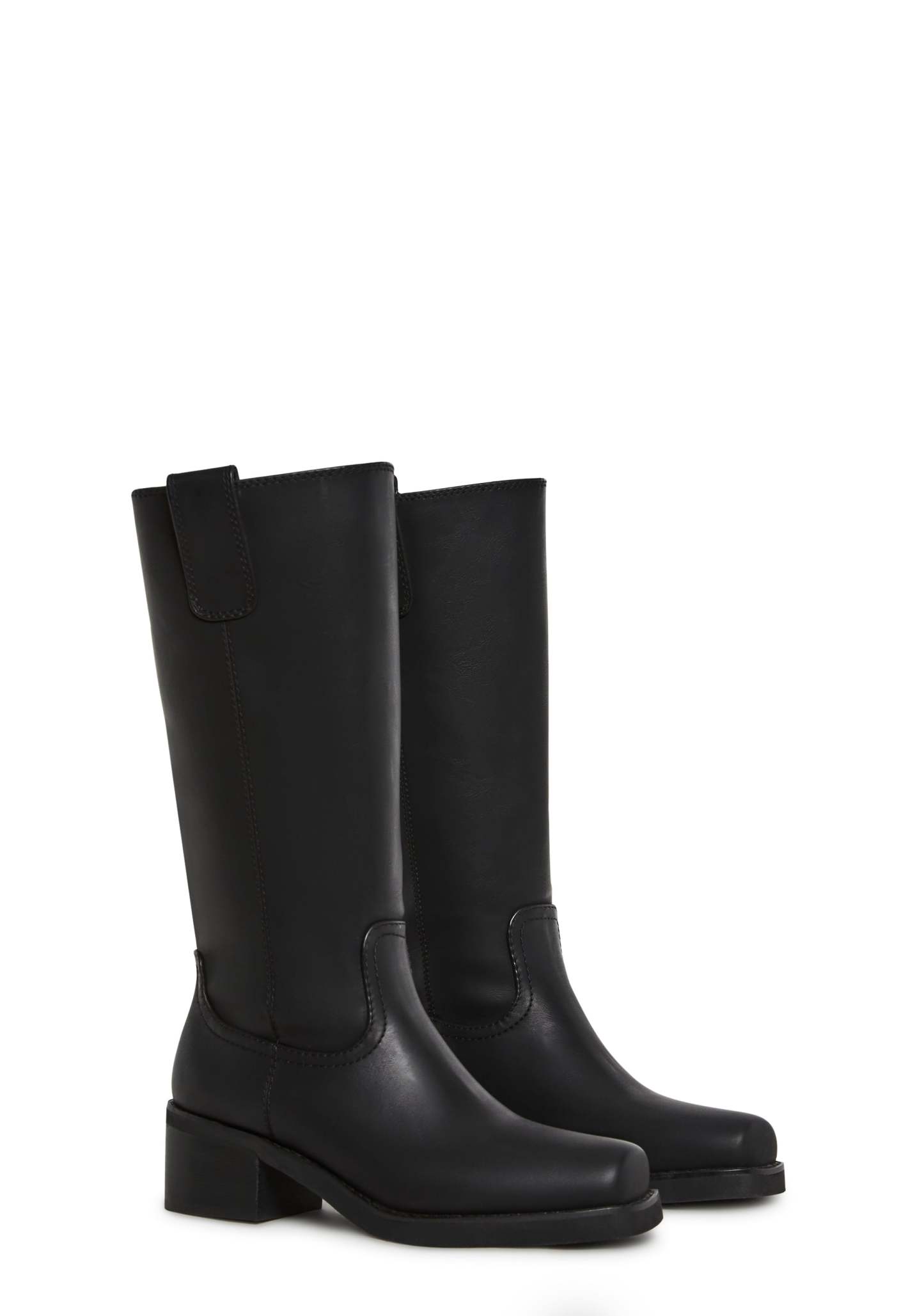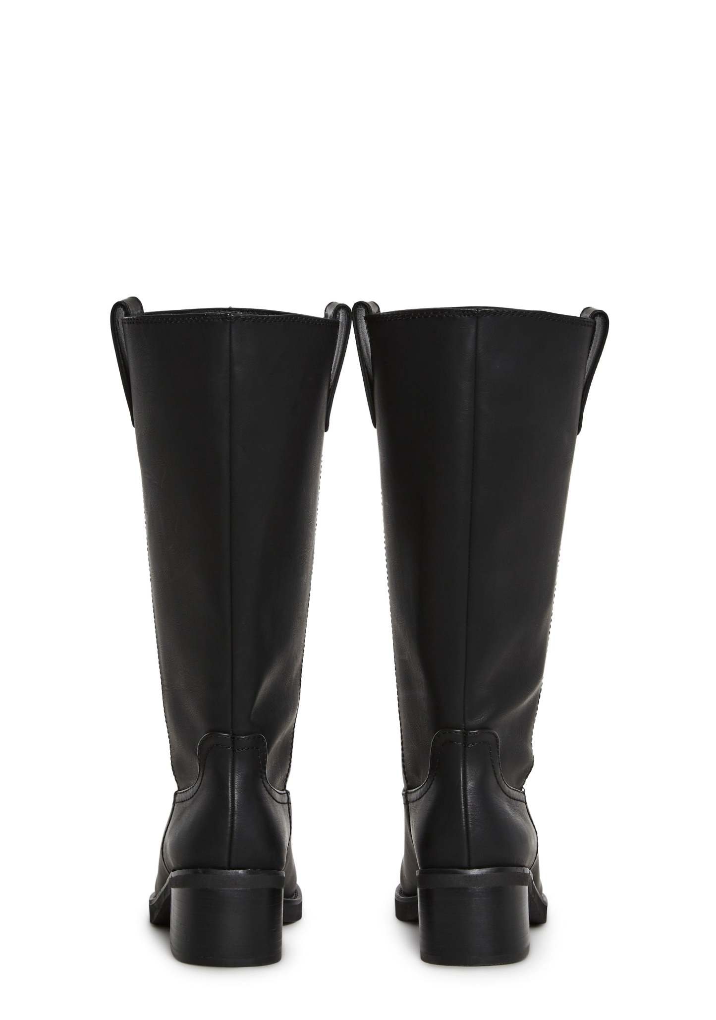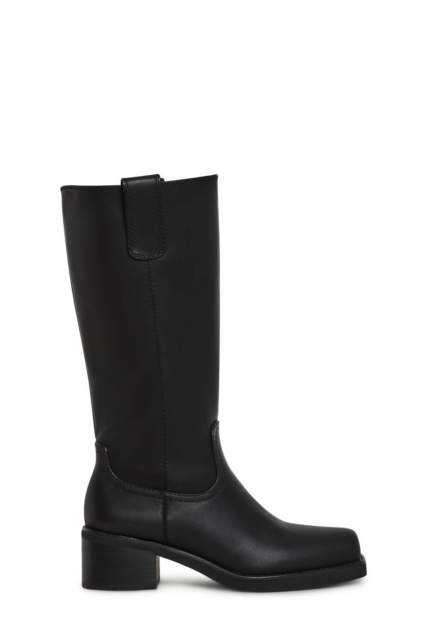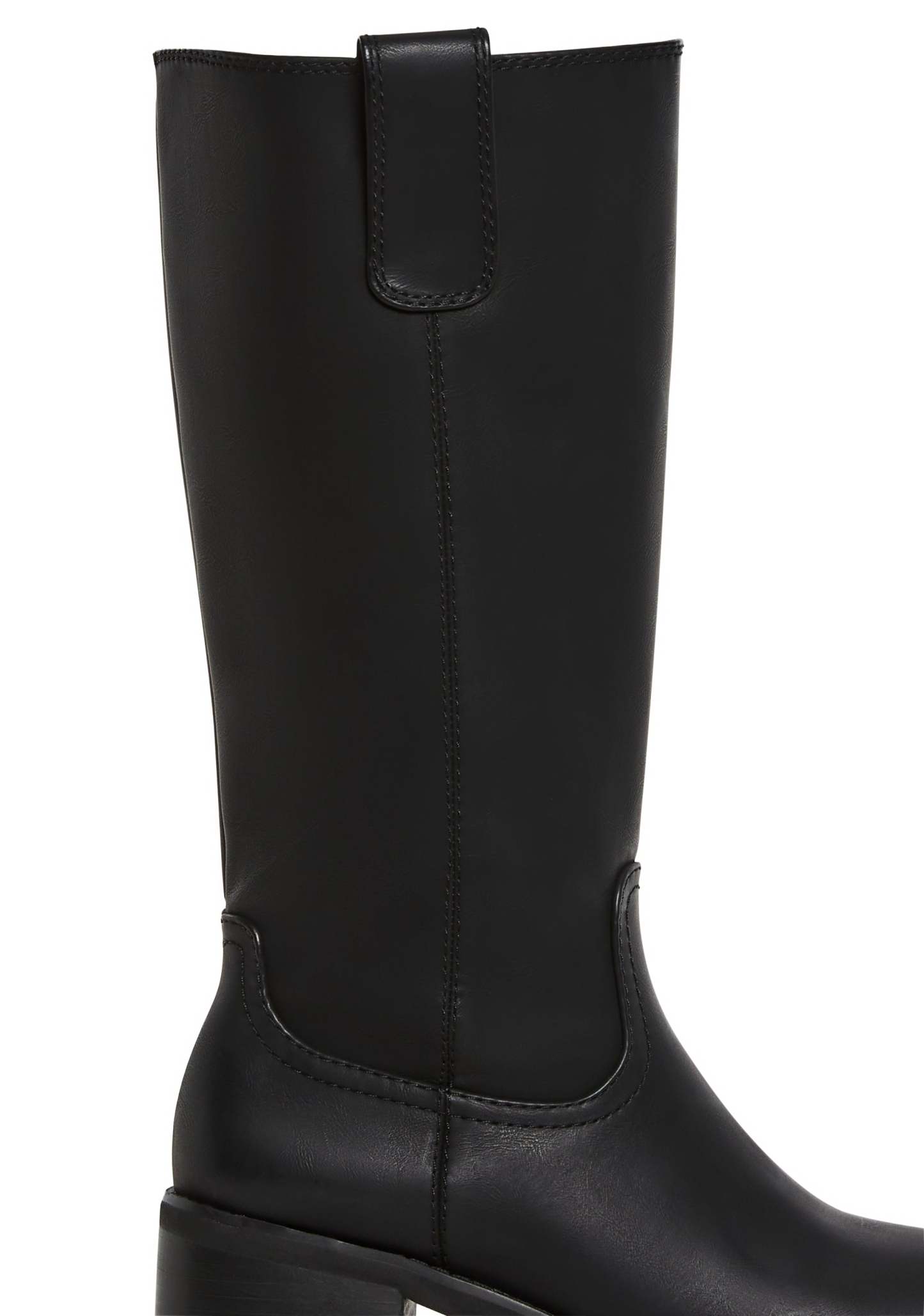 These boots have a vegan leather construction, block heels, pull tabs, and a pull on fit.